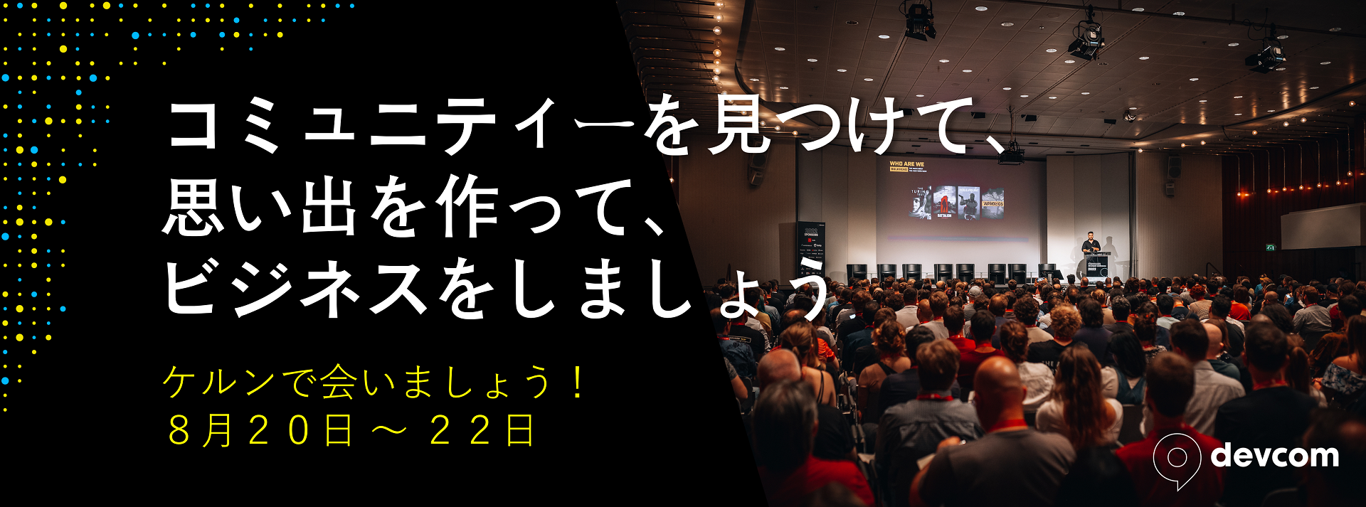 devcomは、gamescom (http://www.gamescom.global/ )の公式開発者会議(devcom Developer Conference)の主催者であり、ゲーム業界関係者のためのヨーロッパ最大のコミュニティベースのイベントです。devcomは年間を通じて、多様性、包括性、持続可能性というコアバリューに基づき、ゲーム業界に特化したコンテンツ、イベント、サービスを提供しています。