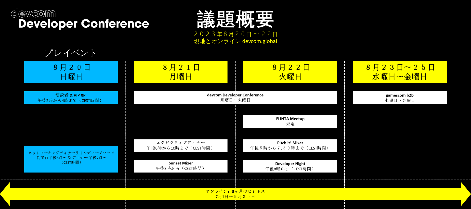 セッション、講演者、プログラムに関する最終的な最新情報は、今後数週間以内に発表される予定です。ゲーム業界関係者の皆様には、ケルンまたはオンラインにて開催されるdevcom Developer Conference 2023へのご参加をお待ちしております!