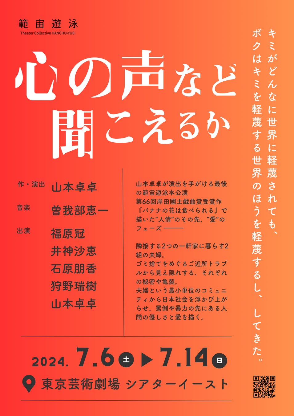 演劇集団「範宙遊泳」は、2021年に書き下ろした“愛”の戯曲『心の声など聞こえるか』を2024年7月6日(土)〜14日(日)、東京芸術劇場 シアターイースト(豊島区・池袋)にて上演いたします。