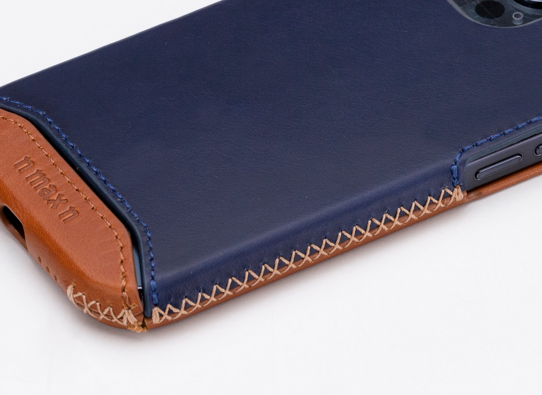 n max nのiPhone 15シリーズのケースは、伝統的なヘリンボーンステッチ(クロスステッチ)で本革を組み合わせた一つ一つハンドメイドでつくり上げられた製品。