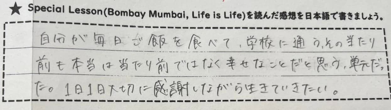 本書は、インドの貧困層に生まれた少年の半生を追体験し、SDGsへの関心を育てる一助となります。2023年2月には同校「英語コミュニケーションⅠ」受講の高校1年生235名を対象に、補助教材として活用されました。(学校として購入したものではありません)