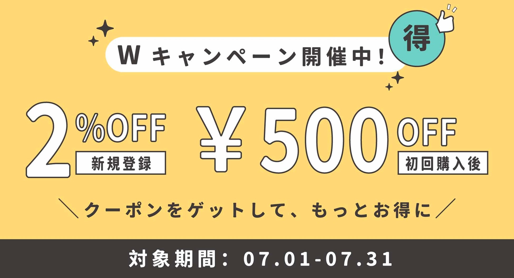 JENEWでは現在、新規登録のお客様と初回購入後のお客様に、次回お買い物にに使えるお得なクーポンを配布しています。キャンペーン対象期間は2024/7/31(水)23:59まで。ぜひこの機会にお得なクーポンを手に入れていただきたいと存じます。