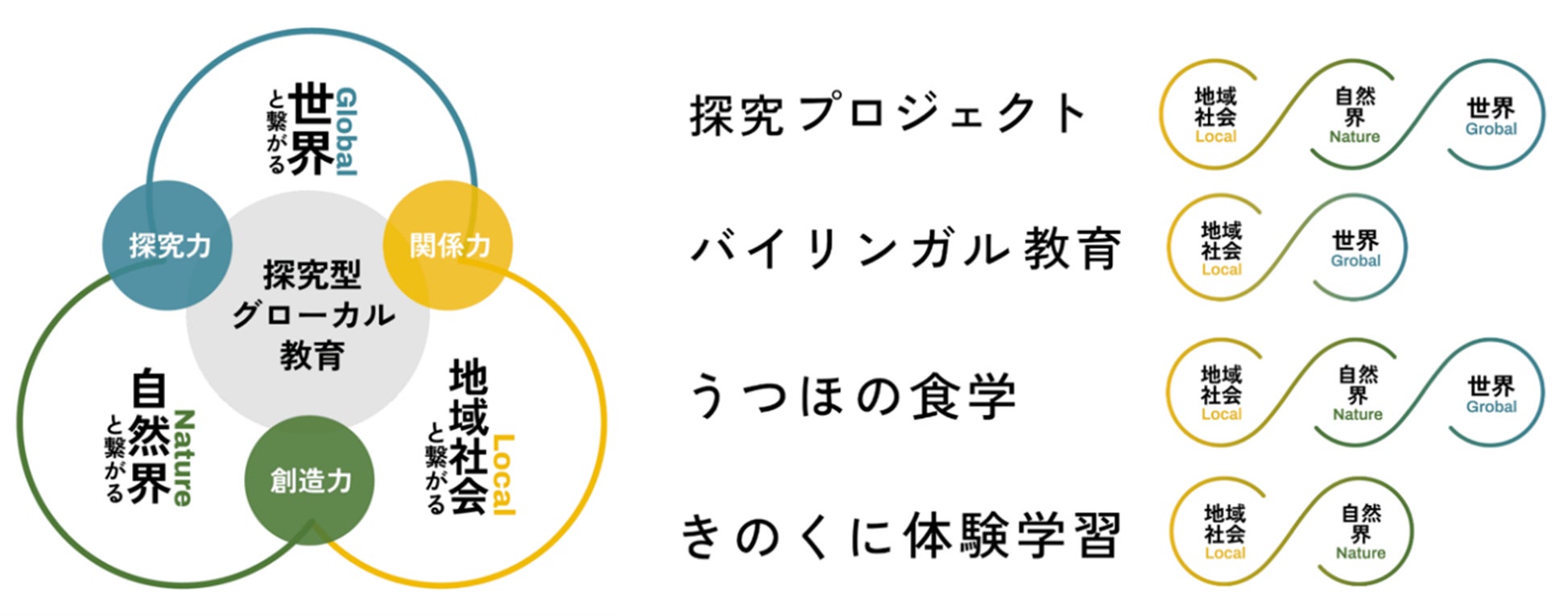 学校理念は、「グローバル社会で幸せに生きる力を全ての子供たちに」「自らの力で未来を開く」「熊野古道と世界がつながる学びの聖地へ」とし、その理念を叶えるために、世界・地域・自然とつながり、関係力・想像力を育んでいく「探究型グローカル教育」を行い、2025年4月開校を目指しています。