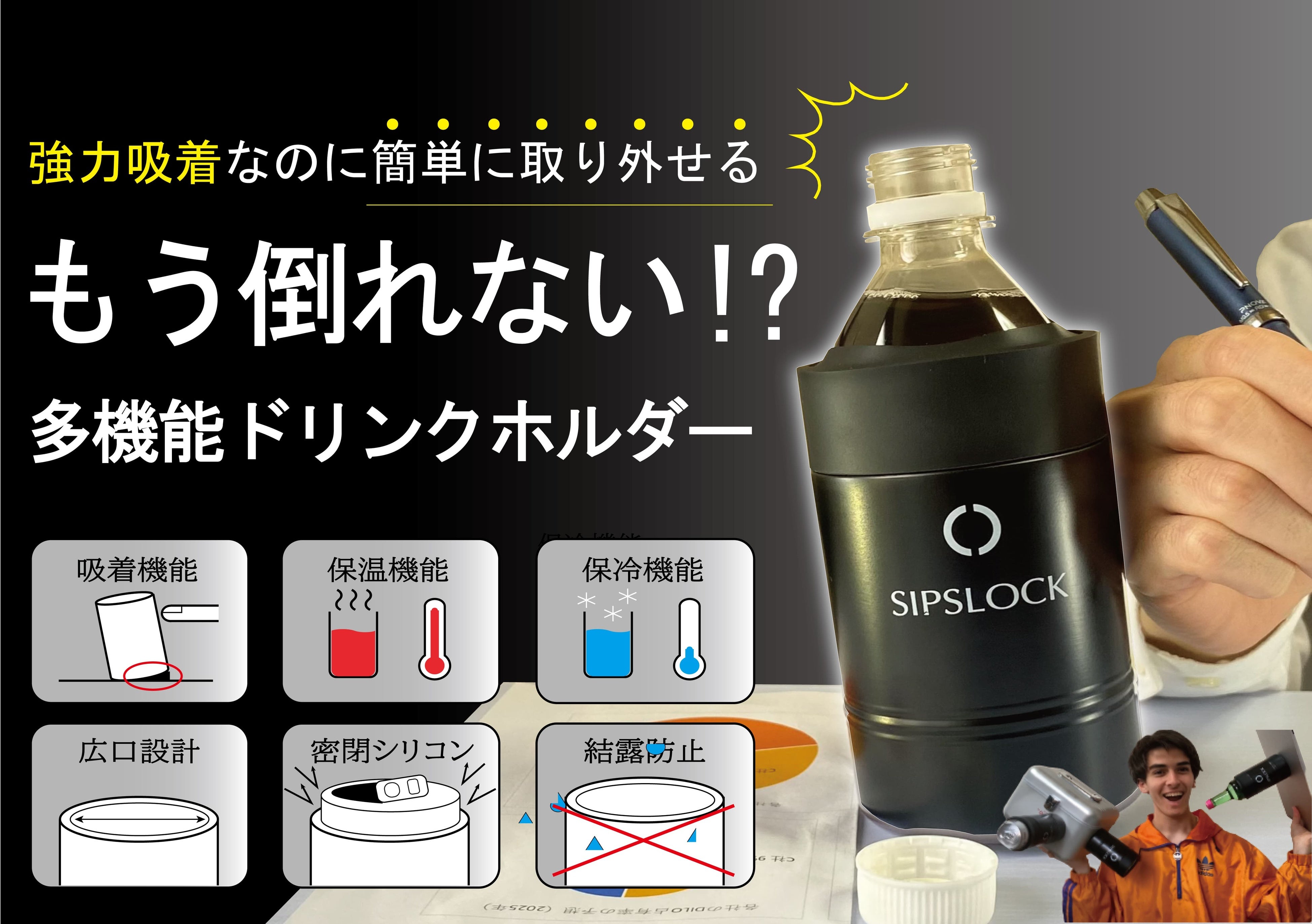 ついドリンクを溢してしまったことのある方必見!キャンプや釣り、テレワークにも使える、強力な吸着力を持つ多機能ドリンクホルダー「SIPS LOCK(シップスロック)」!雨風にも負けない!!