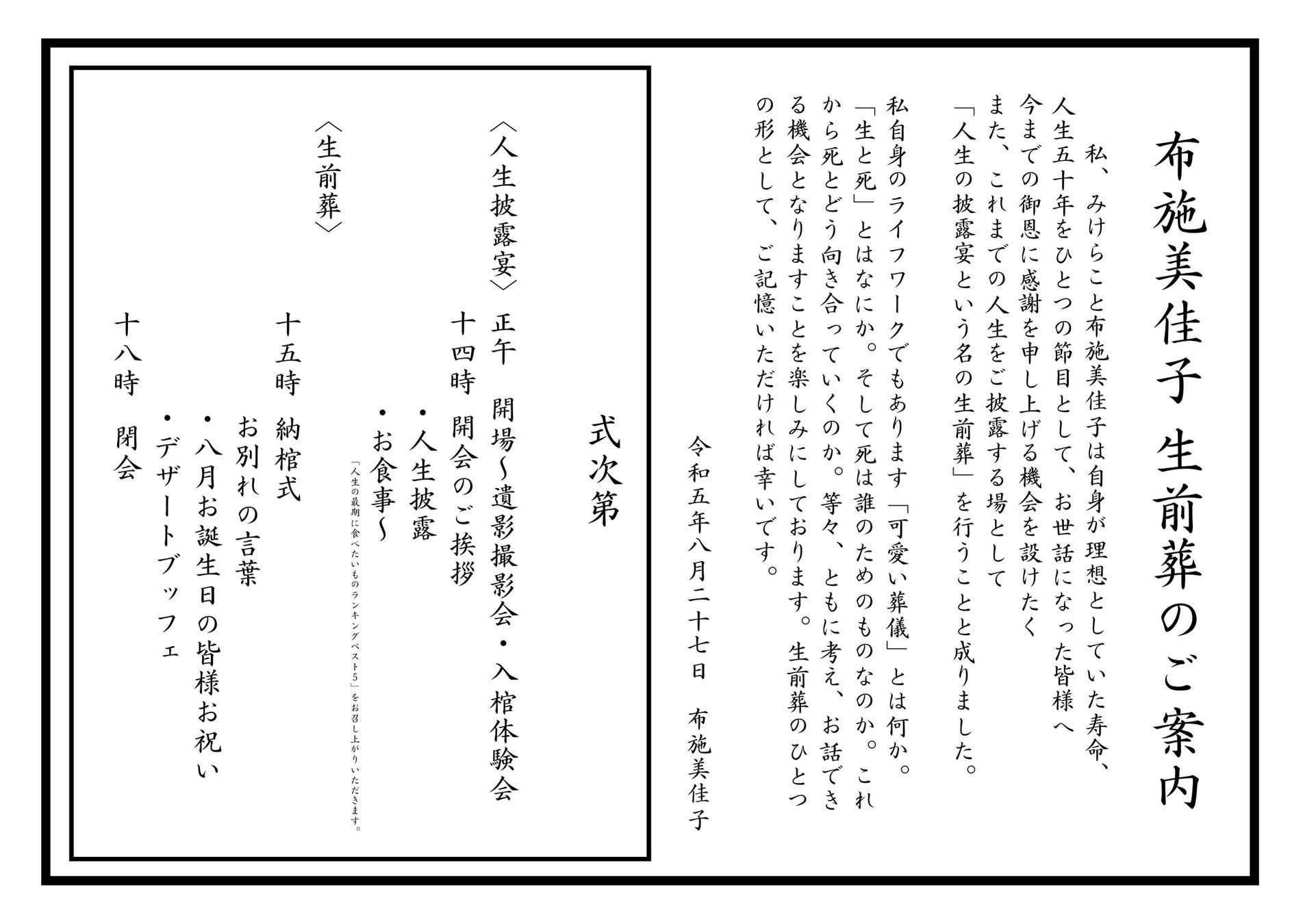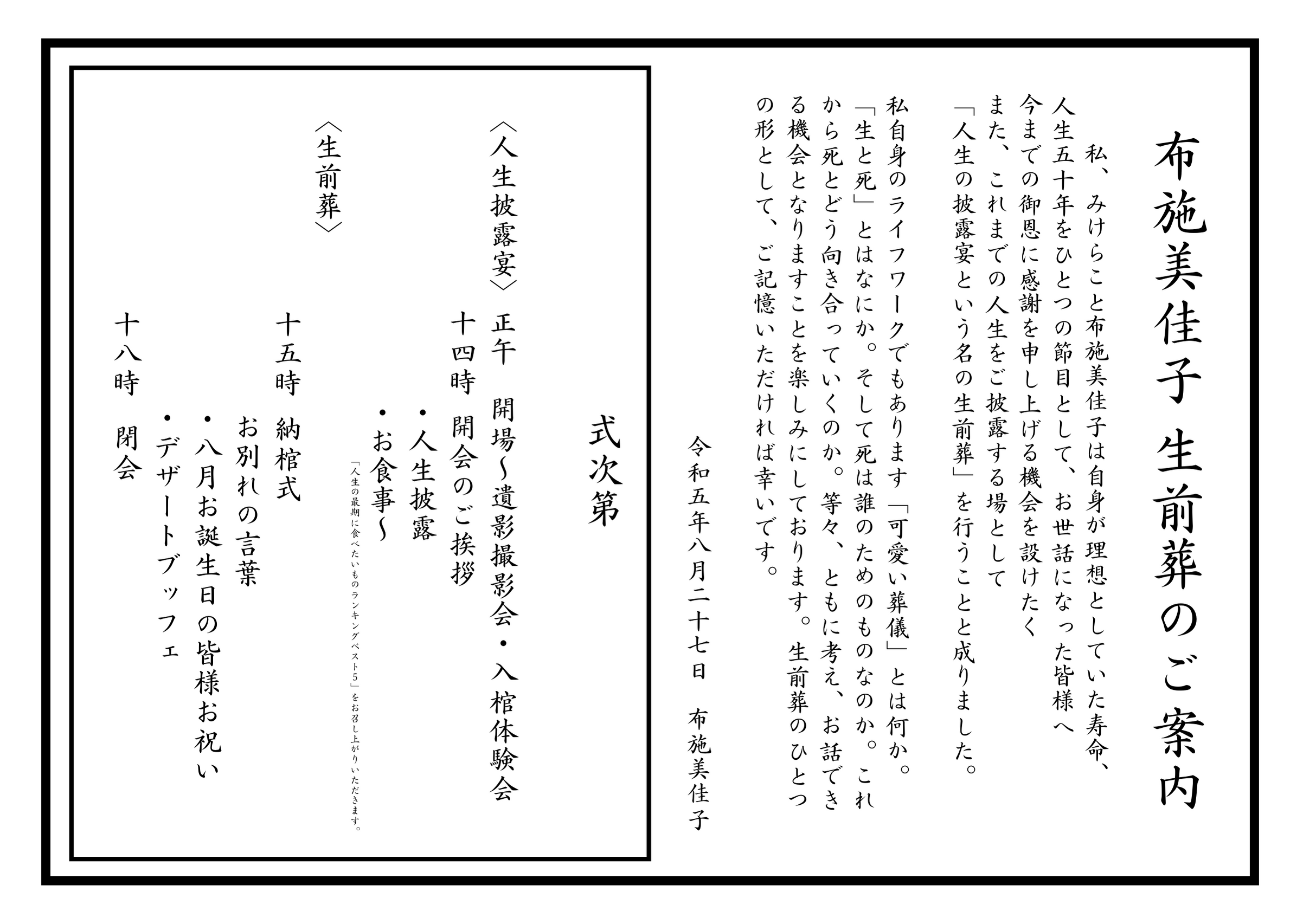 今回の生前葬を、布施は「人生の披露宴」と名づけました。