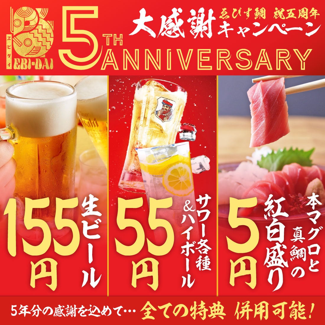 【祝5周年】本マグロと真鯛の紅白盛りが5円!サワー&ハイボール55円、生ビール155円で提供!