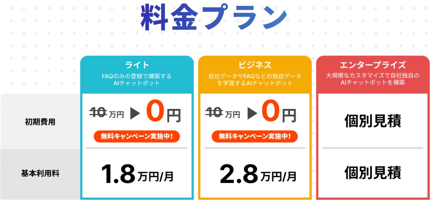 自社データやFAQでカスタマイズ可能な従来型のAIチャットボットの月額利用料は30万円~100万円程度と高額なケースが多いため、これまで一部の大企業しか利用できないサービスでした。