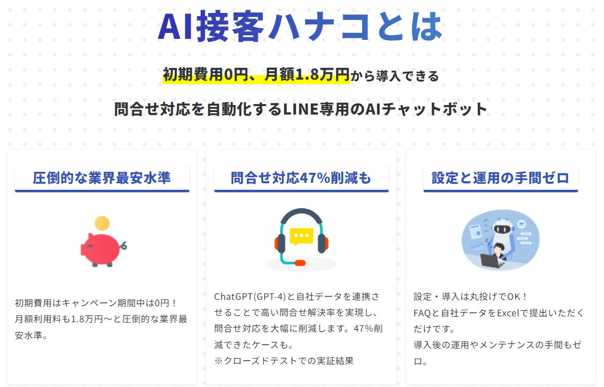 「AI接客ハナコ」は、業界最安水準の圧倒的な低コストと問合せ解決率の高さを実現した、次世代型のLINE専用AIチャットボットです。