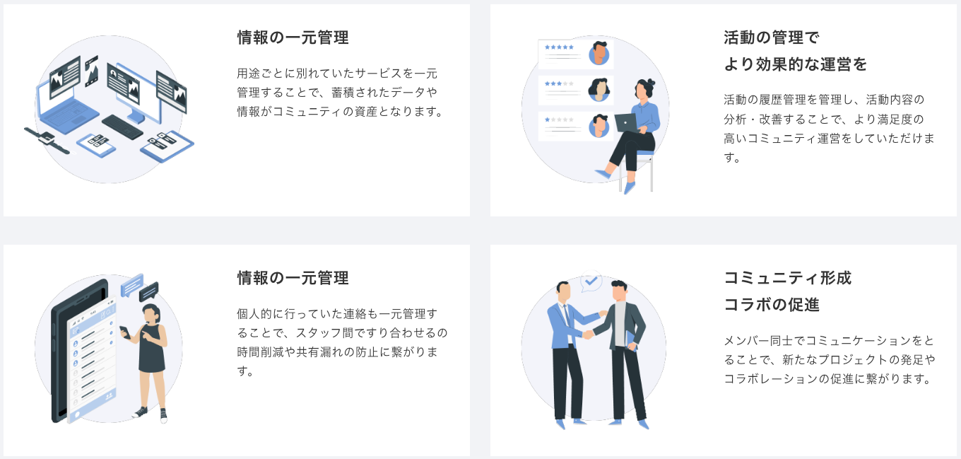 コミュニティ運営に関わるいろいろなツールやメンバー間のやりとりが1つのサービスに全て集約されることでコミュニティ運営の効率化をはかってきました。
