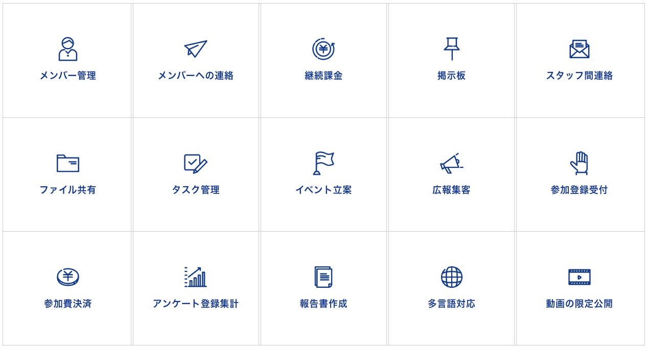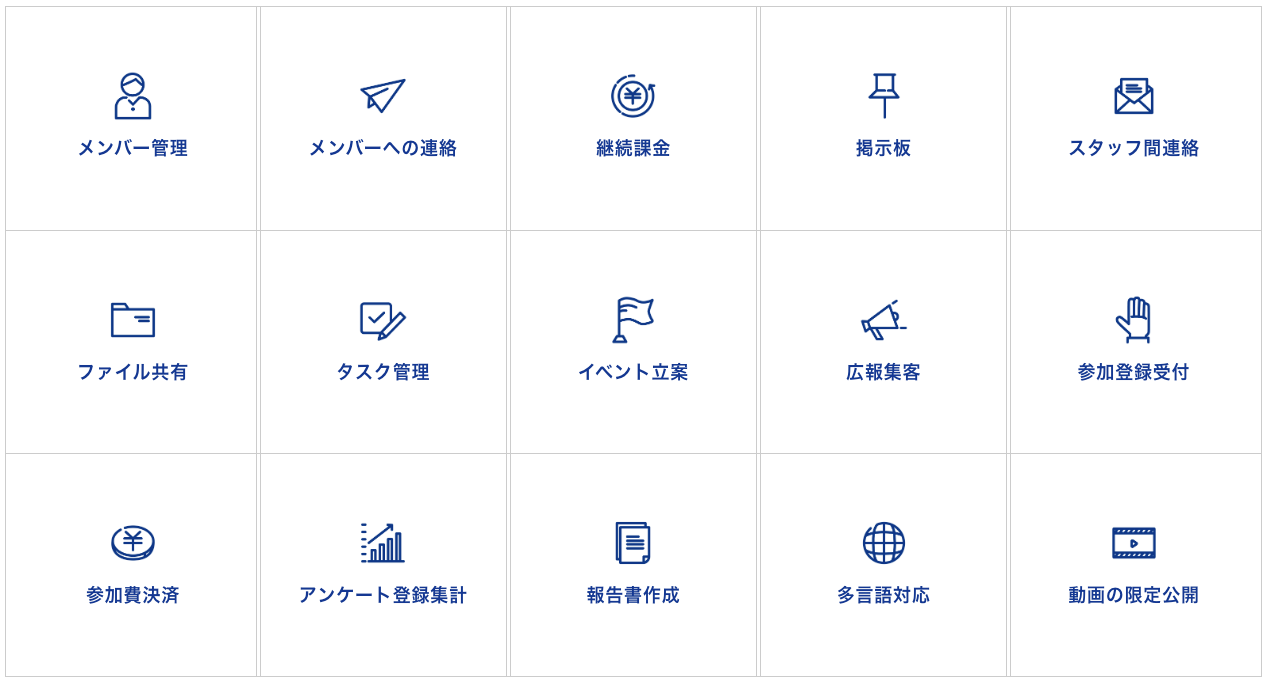 メンバー管理機能、イベント立案、決済システム、コミュニケーションツールなど15の機能を搭載しています。