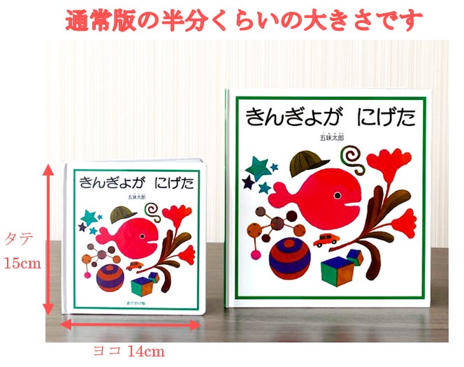 “おでかけ版”は通常の作品サイズに比べて半分ほどの大きさで、小さなお子様でも持ちやすく、また荷物が多いときにもかさばらないので、おでかけに持ち歩くにも便利な大きさです。また、人気絵本2冊がセットになった『おでかけ版 きんぎょが にげた ひよこは にげます セット』は、贈り物にもピッタリです。