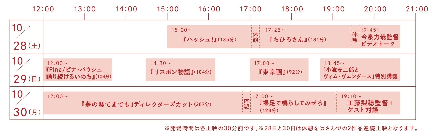記念すべき第1回は、東京国際映画祭に審査委員長として来日するヴィム・ヴェンダース監督を特集し、「東京画」「夢の涯てまでも」「リスボン物語」「Pina/ピナ・バウシュ 踊り続けるいのち」の計4本を上映します。日本映画監督では、今泉力哉監督が創作秘話を告白するプログラム等を実現。「ちひろさん」(2023年/監督:今泉力哉)、「ハッシュ!」(2001年/監督:橋口亮輔)、「裸足で鳴らしてみせろ」(2021年/監督:工藤梨穂)など、国内外から高い評価を受けている3作品を上映いたします。また、各日、上映作品にまつわるレクチャーやトークショーも実施予定です。奥深い映画の世界を味わいながら、豊潤な時間をお楽しみいただけます。