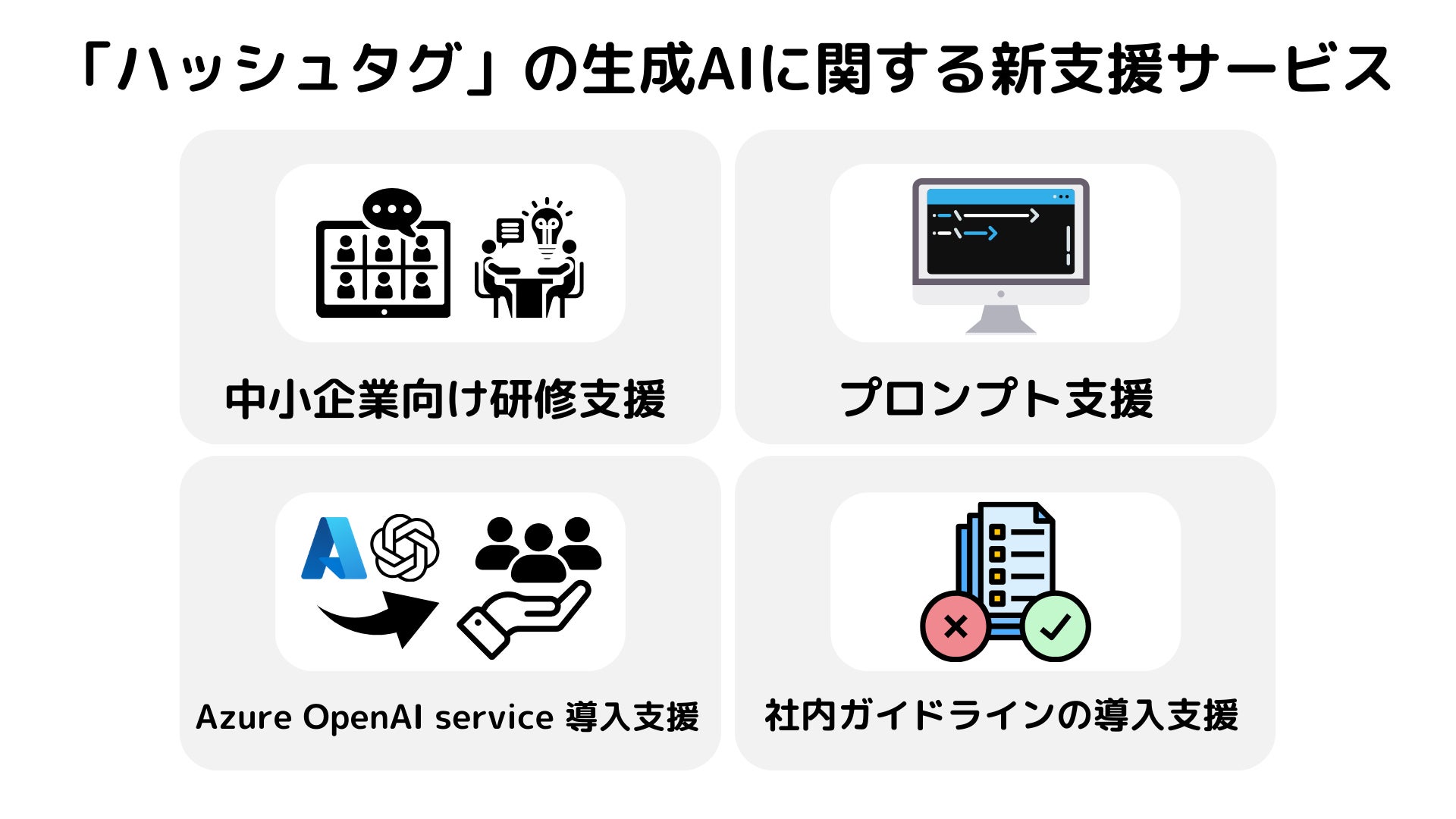 当サービスは、中小企業向け研修支援、プロンプト支援、Azure OpenAI service導入支援、社内ガイドラインの導入支援を軸に、生成AIを効果的に活用するための情報をご提供いたします。