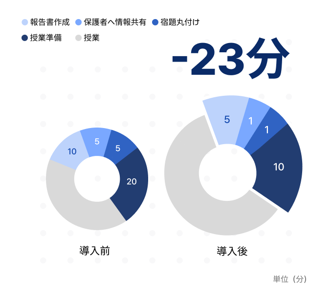 授業以外にかかる時間が平均で20分程度の削減が可能です。数学バンクのAIを利用して削減した時間で、より授業に集中してAIにはできない、先生の能力を最大限に引き出すことができ、ストレスも減少させることができます。