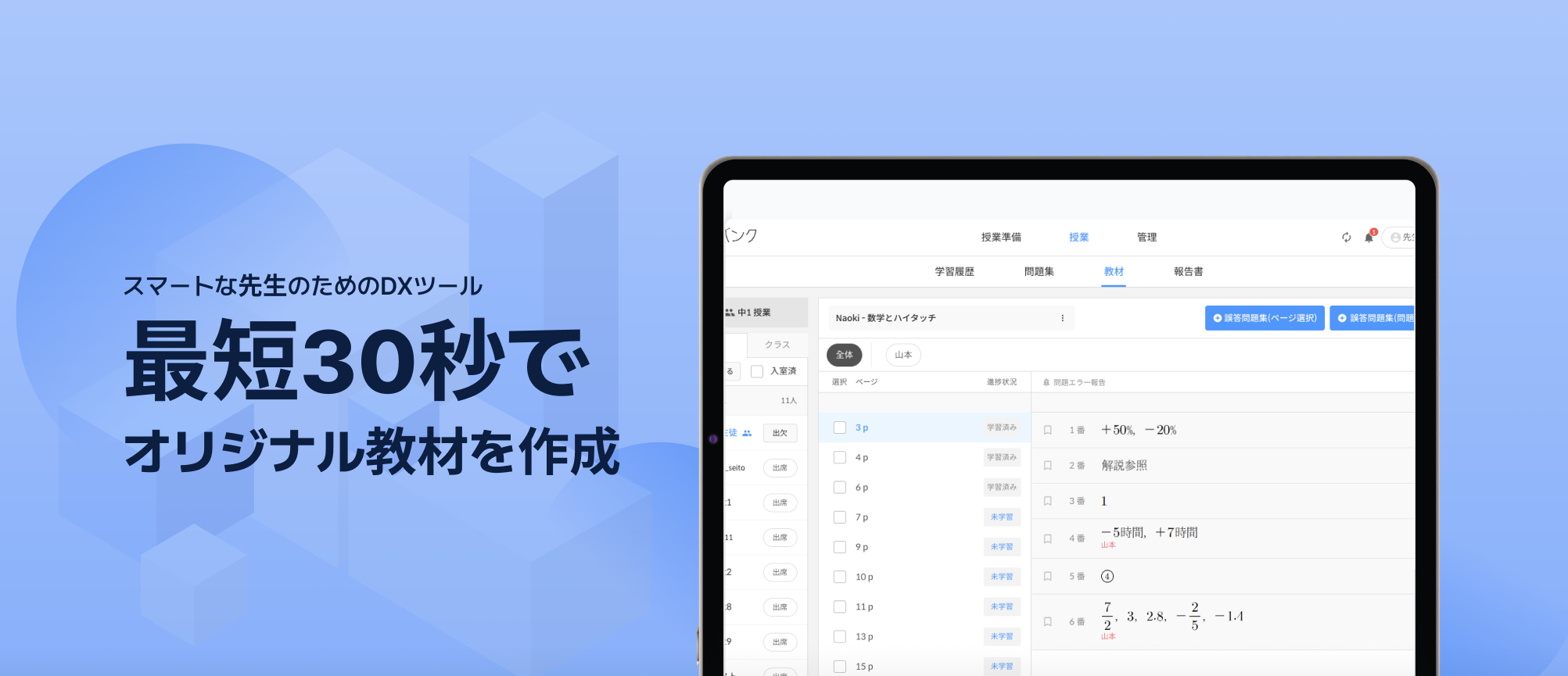 数学バンクは、AIが代替できない価値である「先生の存在」を最大限に活かすために、授業の準備や雑務をサポートし、先生の業務効率向上に取り組みます。業務効率向上することにより、AIにはできない、先生だけが持つ生徒のやる気を引き出し、夢に向かって進むことをより一層深くサポートする時間を創出します。