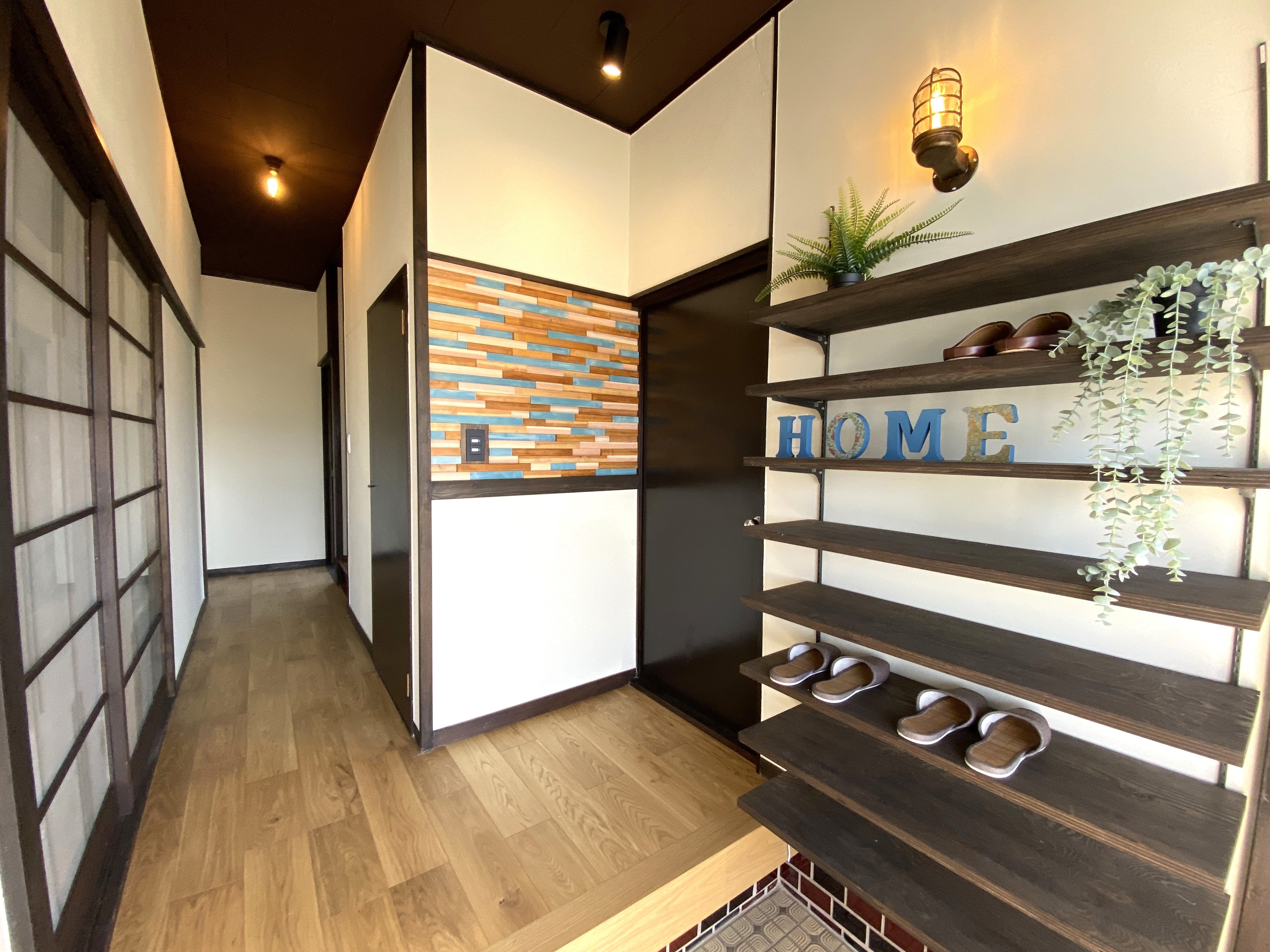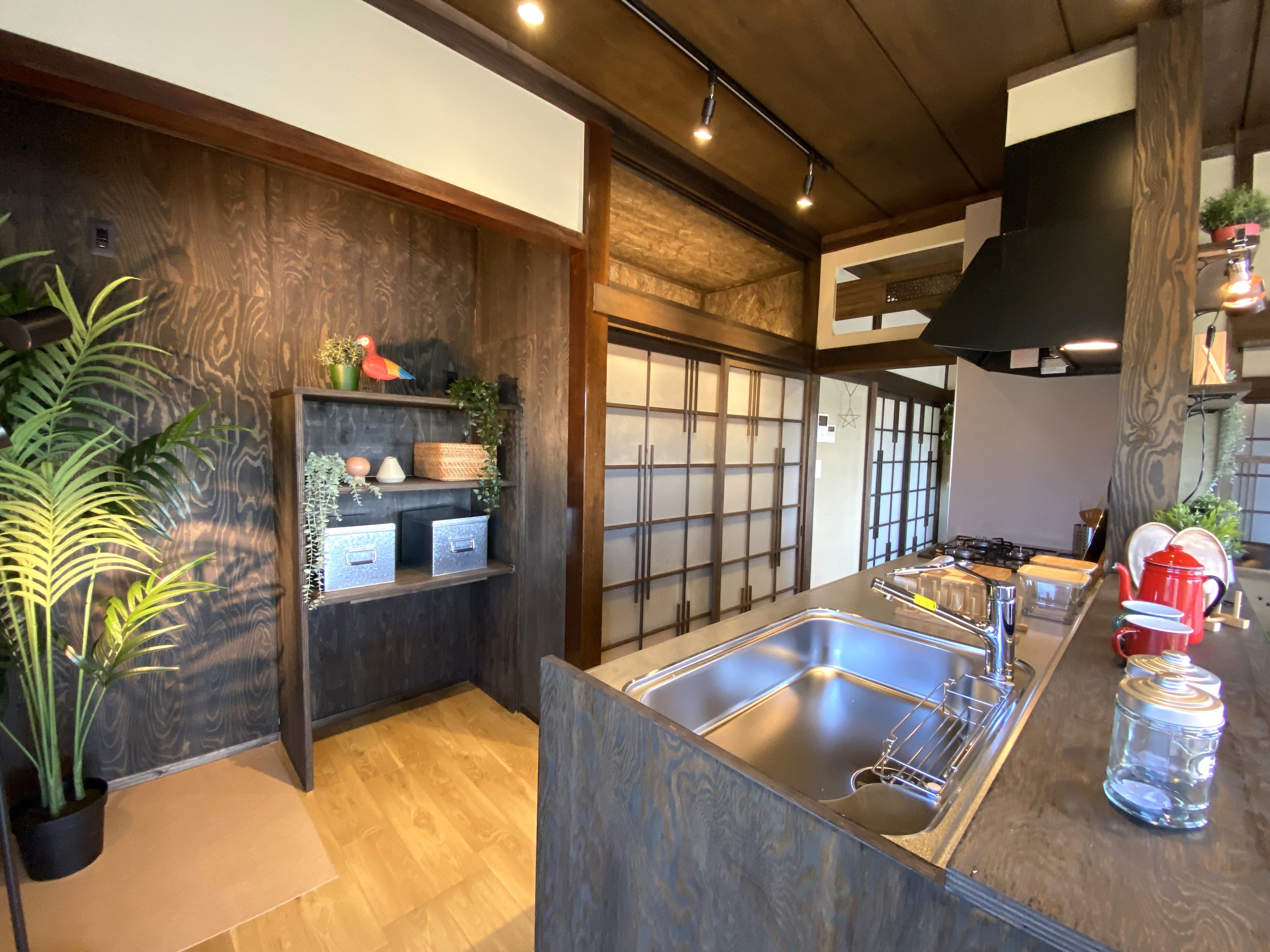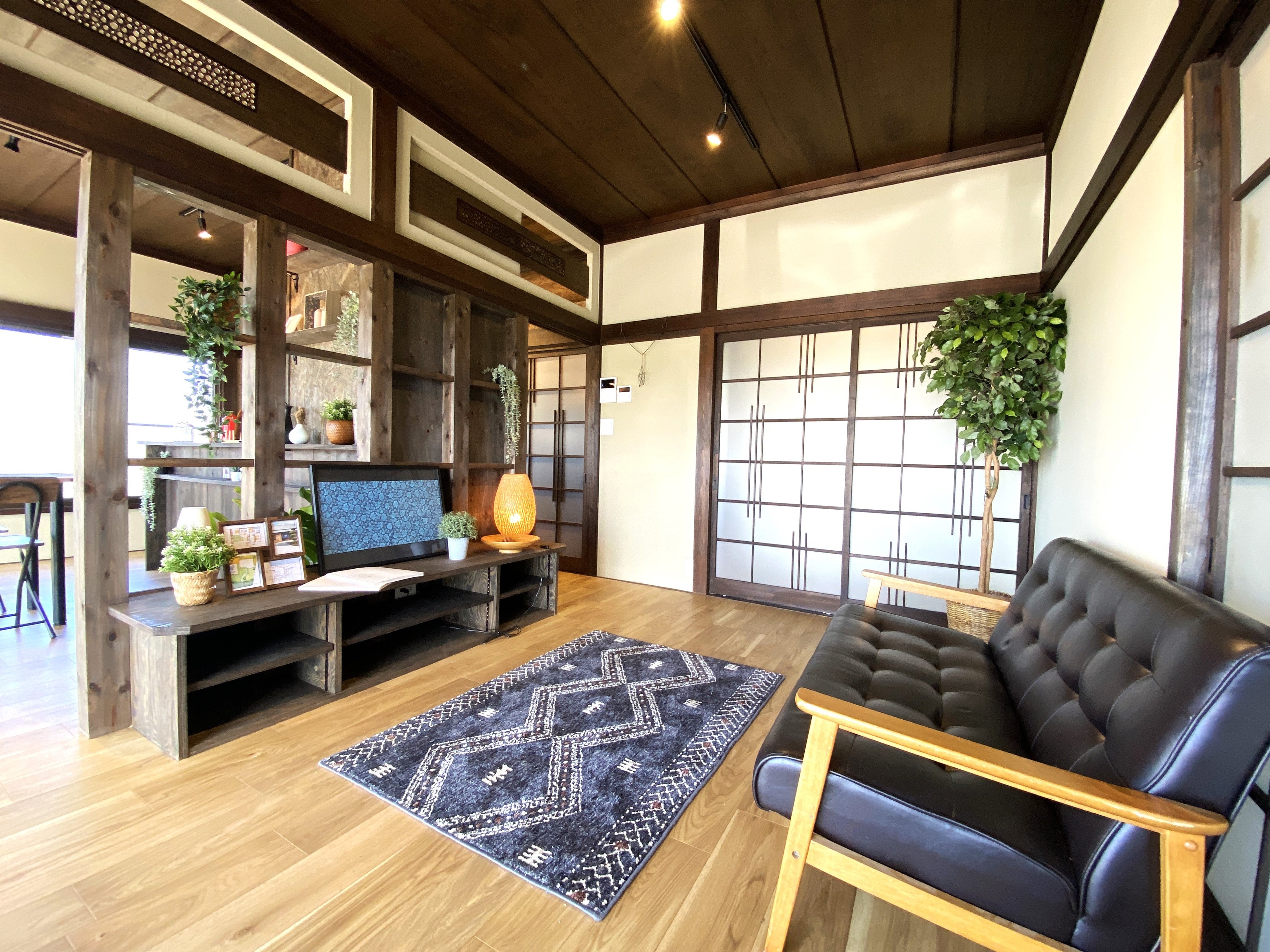 もともとの和造り感を活かし、赤の軒天がポイントの古民家風に仕上げた外観や南側の和室2間を広々としたLDK。既存の古建具をふんだんに再利用し、ほっと落ち着くデザインへ仕上げています。