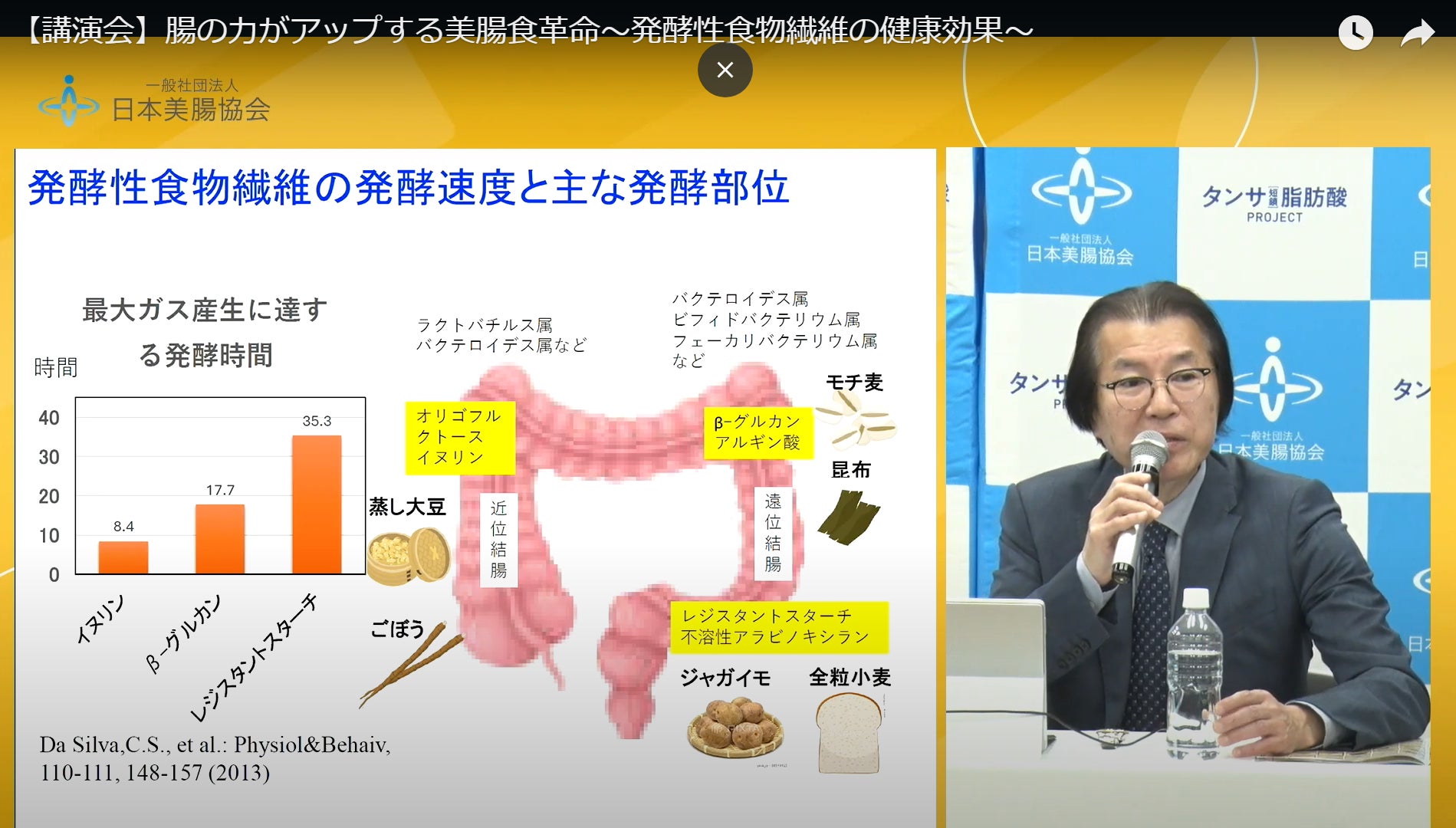 第1弾(2022年1月29日)、第2弾(2022年11月26日)に続き第3弾となる今回の講演では、これまでのアンケートを再集計し発酵性食物繊維についてより学びを深めることができる講演に発展。「日本人はどのくらい食物繊維摂取を目指せば良いのか?」について根拠を元に解説いただきました。また発酵性食物繊維の発酵速度と腸内での発酵部位の違いを解説。腸は全長約9メートルにも上る大変長い臓器であり、1000種類、100兆個も存在する多種多様な腸内細菌を活かす為の食事方法についても具体的な食品例を紹介いただきました。