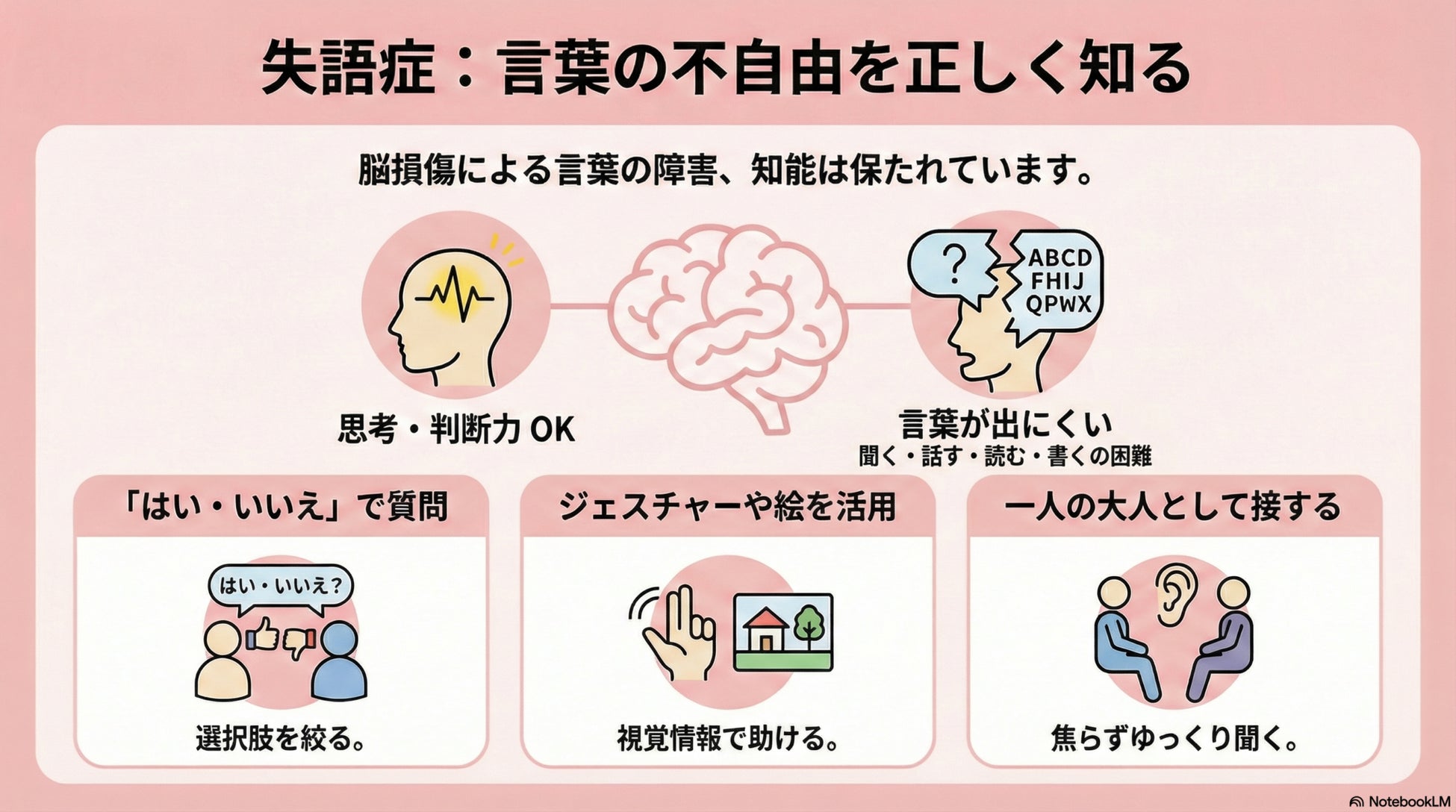 失語症は脳卒中・頭部外傷などの後遺症として発症し、「話す・聞く・読む・書く・計算」に困難をきたす言語障害です。国内患者数は約50万人にのぼりますが、社会的な認知度は依然として低く、「見えない障害」とも呼ばれます。
