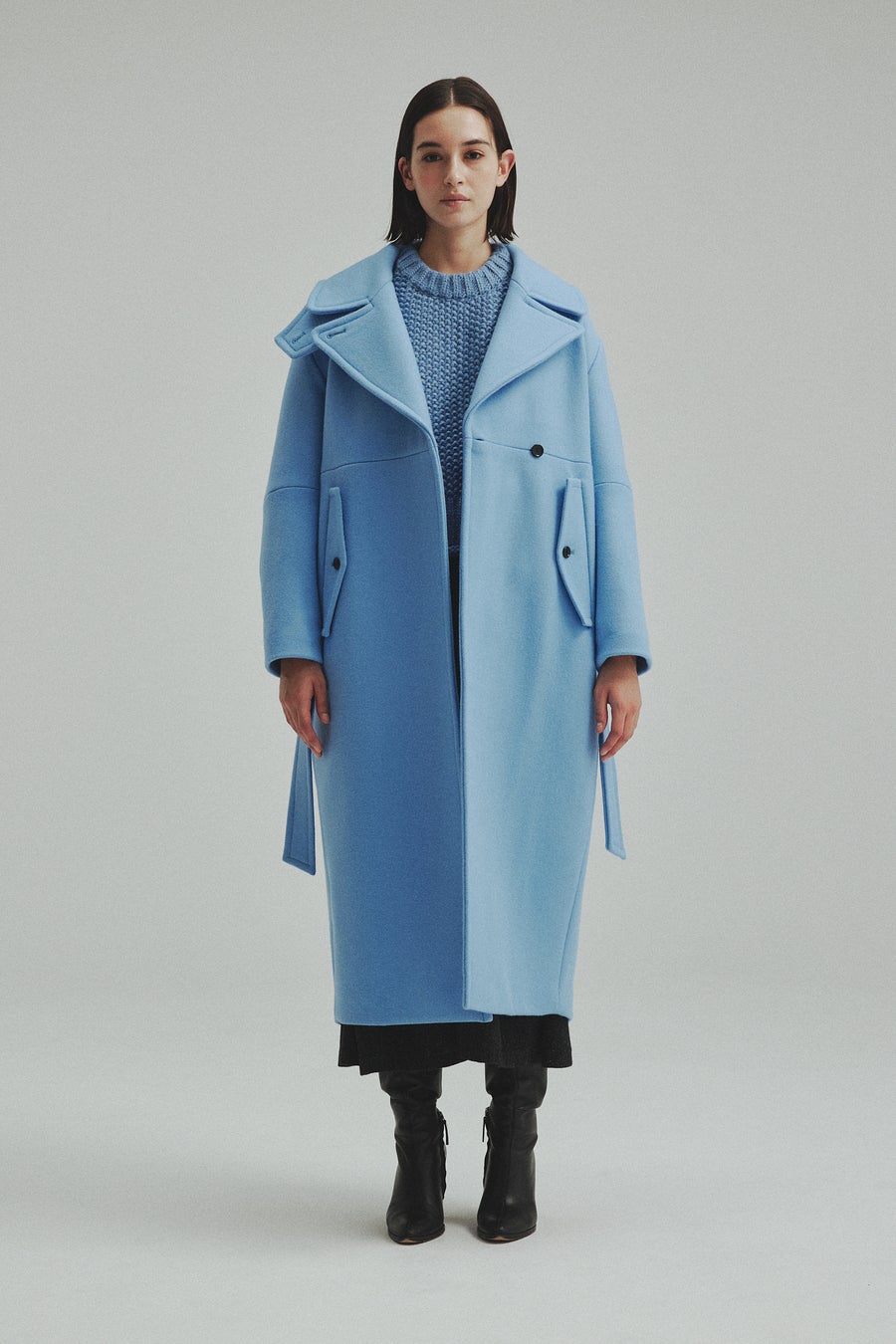 ① Double-breasted Wool coat(Blue)・Cropped knit tops(Blue)・Waist Drape Balloon skirt