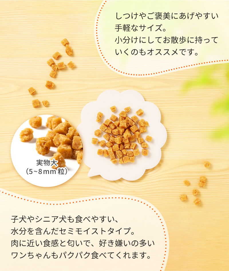 羊膜・プラセンタの他にもワンちゃんの健康をサポートする「乳酸菌」や「タウリン」も配合。肉の風味・旨味はもちろん、栄養素を壊さないセミモイスト仕上げだから食いつき抜群!