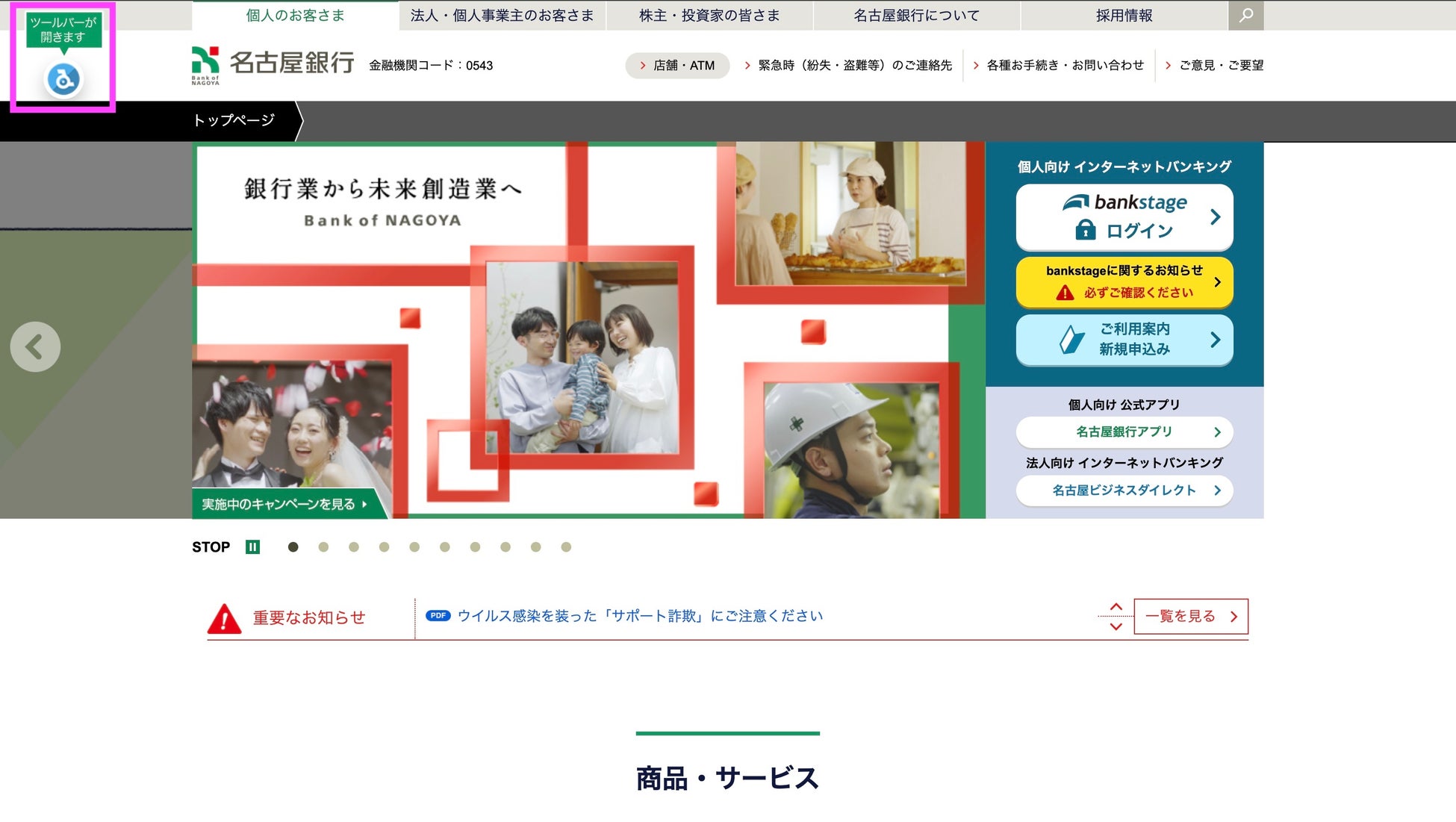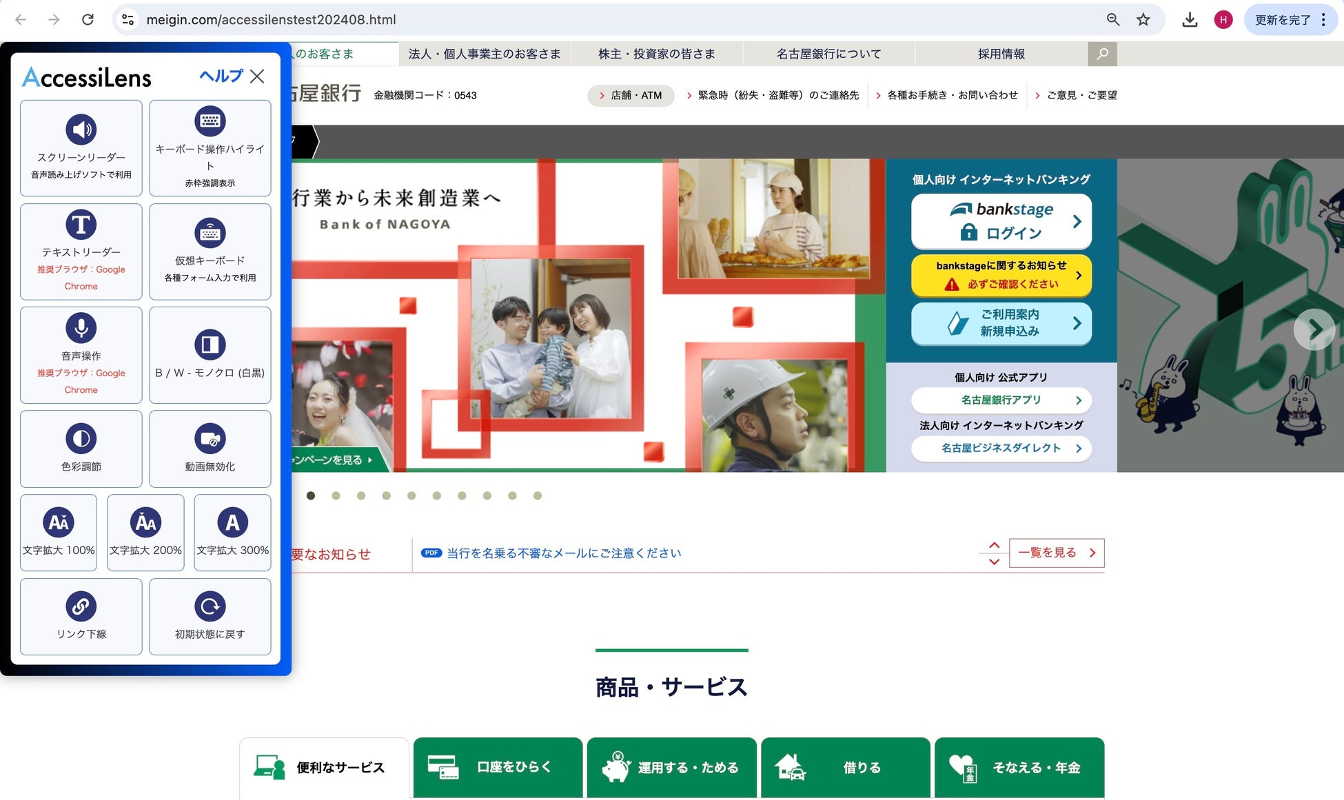 アクセシレンズ株式会社(本社:東京都中央区、代表取締役:柳平 大輔、以下 アクセシレンズ)は、株式会社名古屋銀行(本社:愛知県名古屋市中区、取締役頭取:藤原 一朗、以下 名古屋銀行)が運営するウェブサイトに、ウェブアクセシビリティツール「アクセシレンズ」が導入されたことをお知らせいたします。