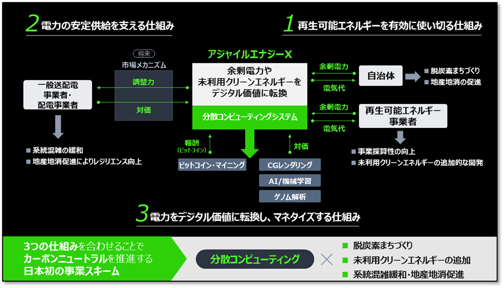アジャイルエナジーXは、再エネの連系待ちおよび出力制御に伴う再エネ導入の機会損失回避に向け、柔軟に電力需要を創出可能な分散エネルギーリソース(DER)として、分散コンピューティングの一種である「ビットコイン・マイニング」に着目しました。