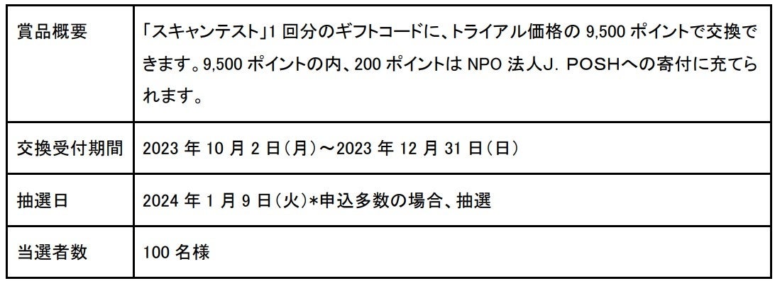 今回、取り組み実施にあたり、「スキャンテスト 乳がん」は、ピンクリボン運動を推進するNPO法人へのポイントによる寄付がセットになった、期間・数量限定・トライアル価格でご用意いたします。