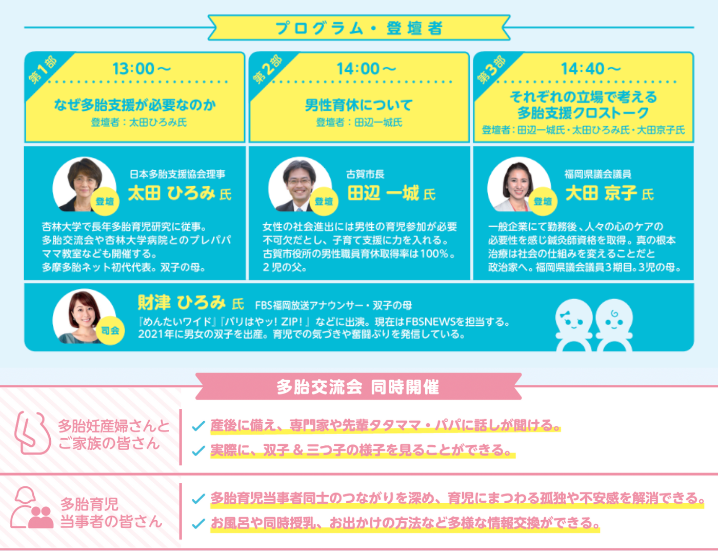 当日は、多胎育児の専門家や有識者によるトークセッションと、多胎世帯の交流会を同時開催いたします。