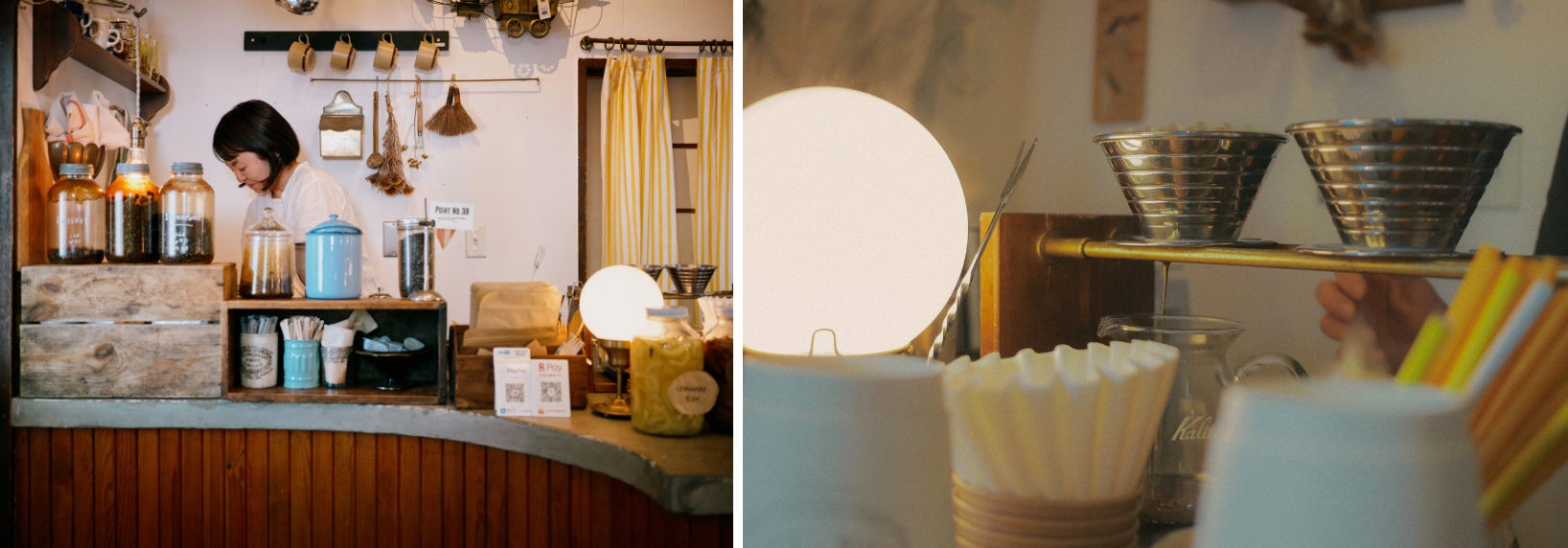 POINT NO.39 の店舗内に併設される小さなコーヒーショップ「スナオコーヒー」 。ヴィンテージのテーブルやハイスツールでくつろぎながら、丁寧にハンドドリップされたコーヒーとともにゆったりとした時間をどうぞ。