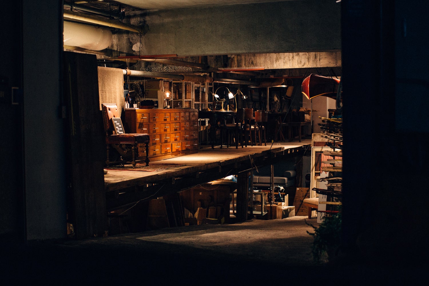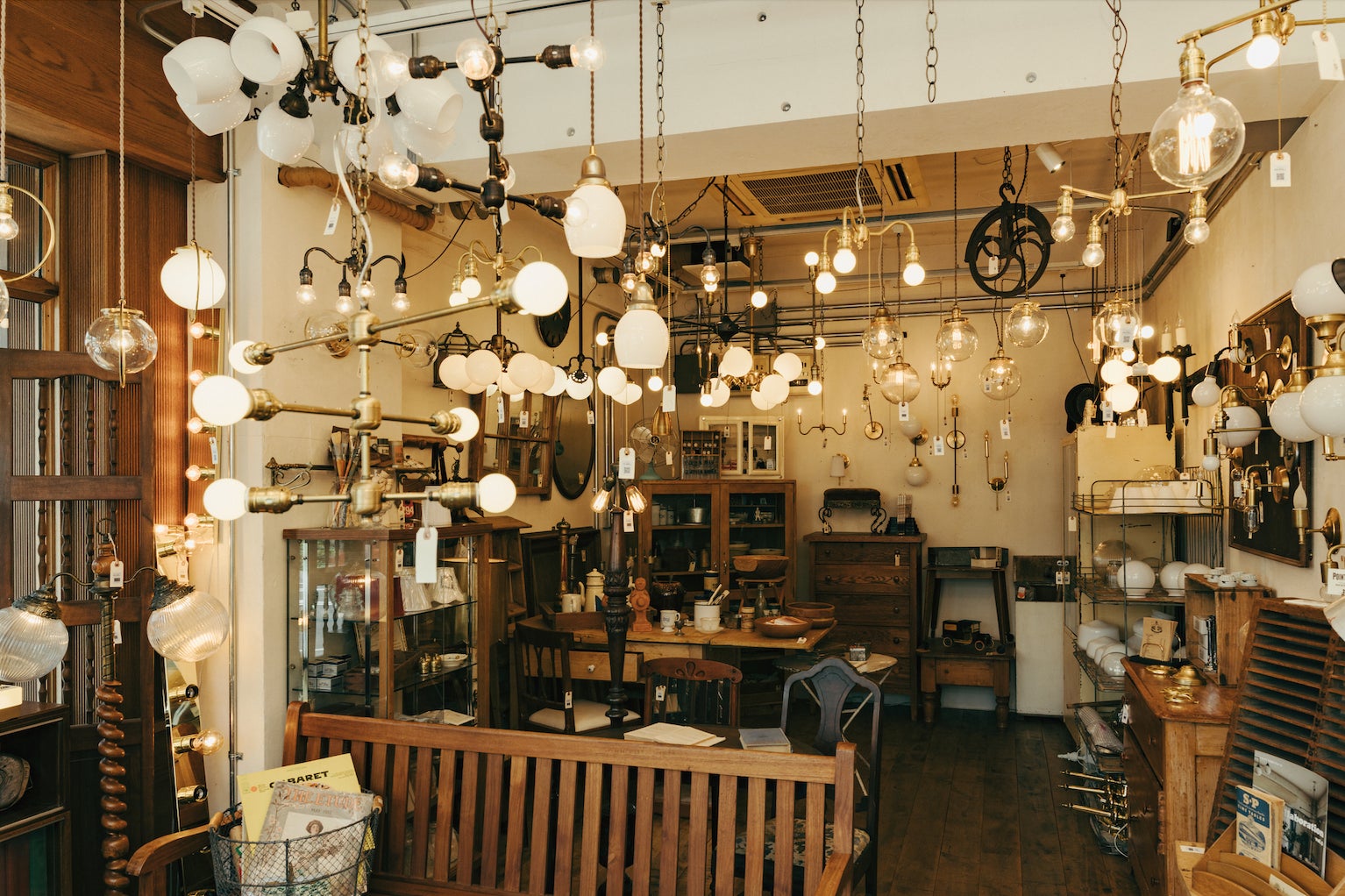 2階は、ヴィンテージ・アンティークの照明や家具、自転車などが並び、欧米のアンティークモールのような空間に。これまで展示が難しかった大きなサイズの家具も多数ご覧いただけます。リペア工房も備え、修復中にはその様子をご覧いただくことも可能です。
