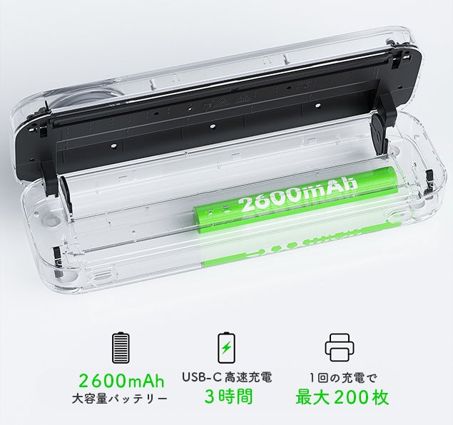 フル充電でA4サイズの感熱紙を最大200枚プリントが可能です。