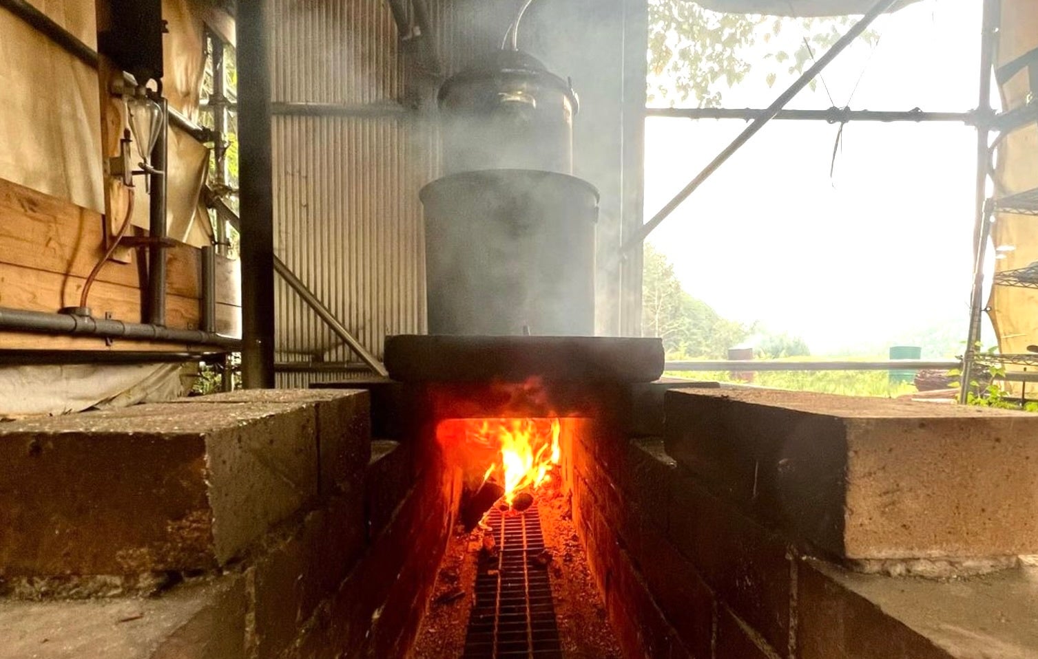 蒸留する水には、かって山葵畑で使用されていた山の清水を使用し蒸留する燃料も電気やガスを使用せずに『薪の高火力』にて蒸留し製品化しています。