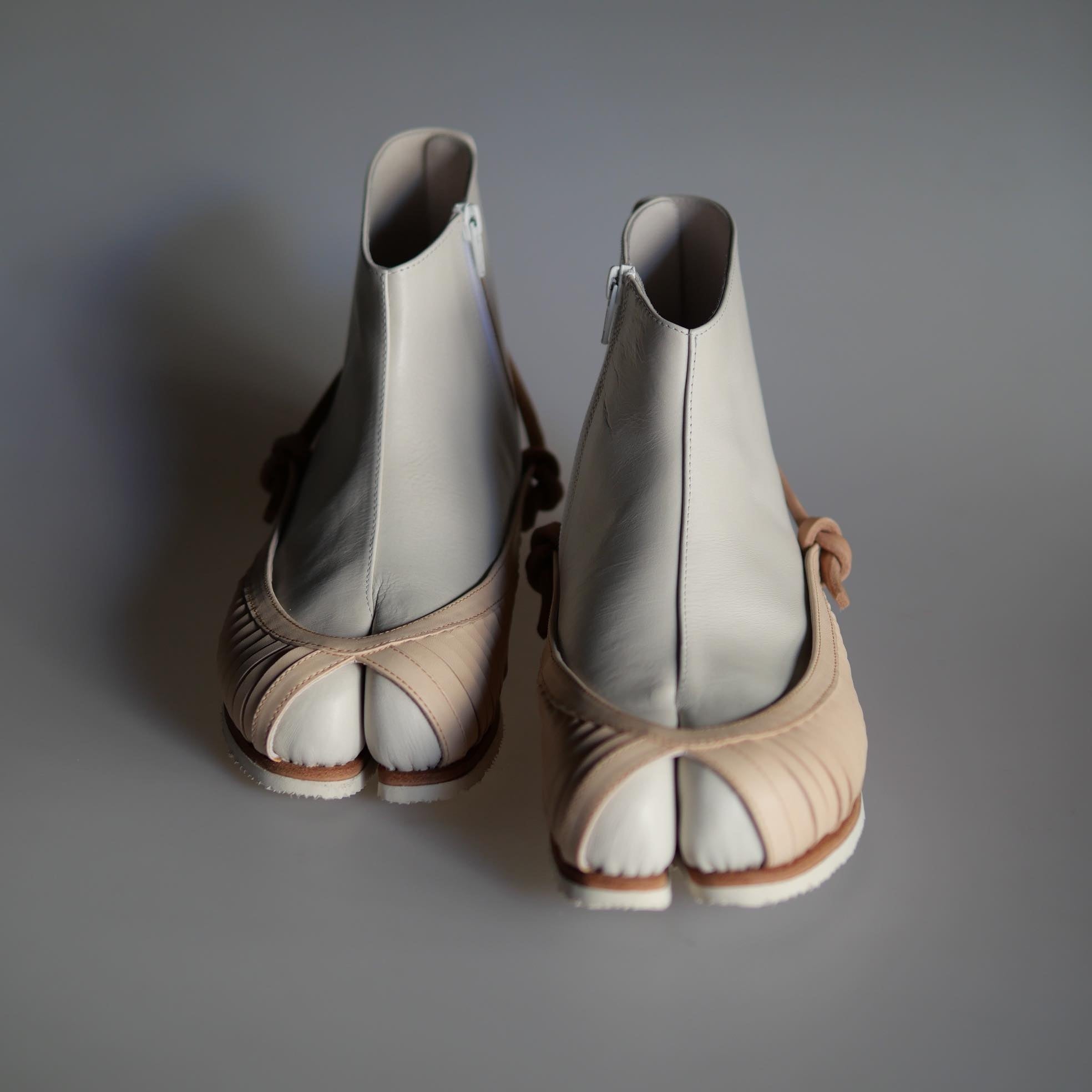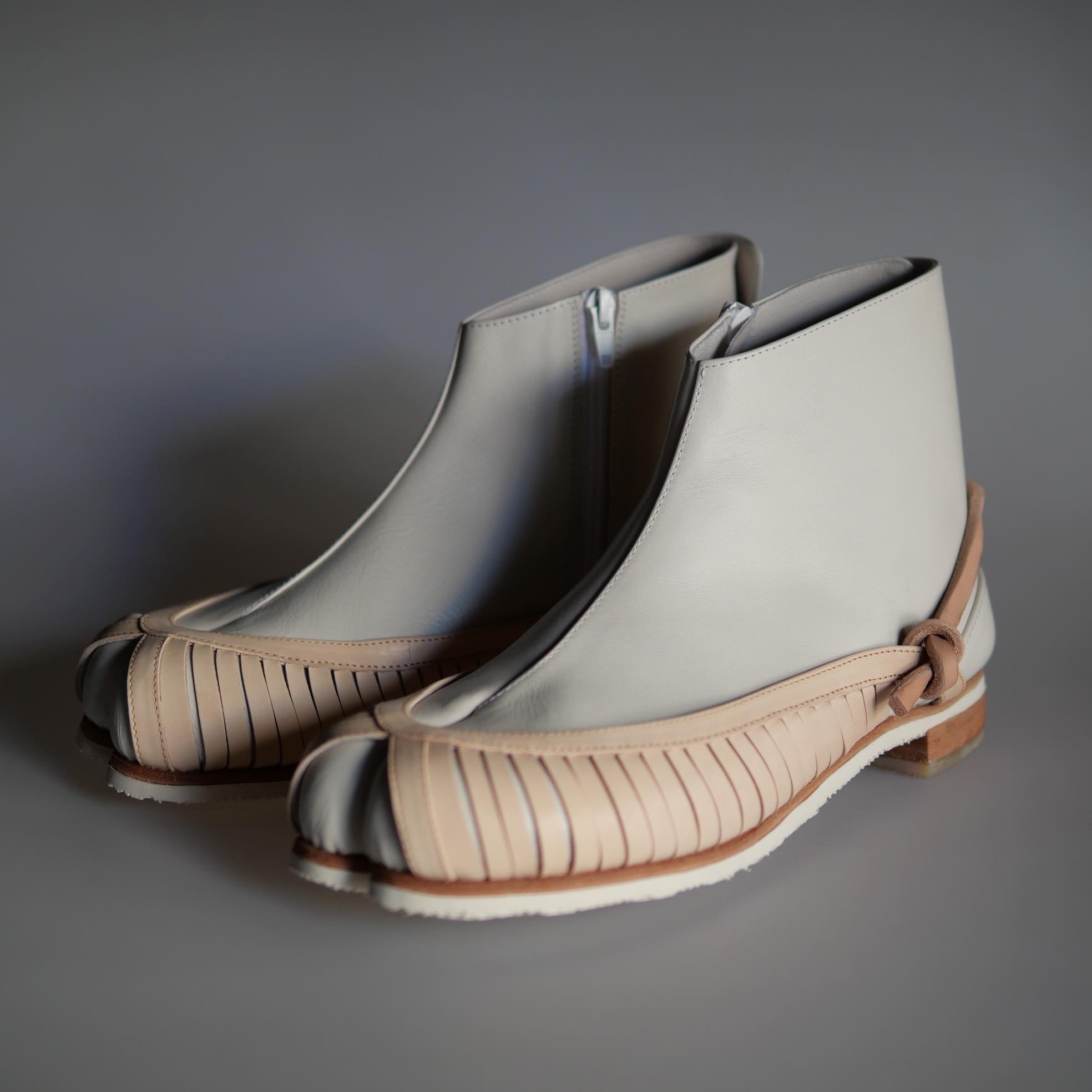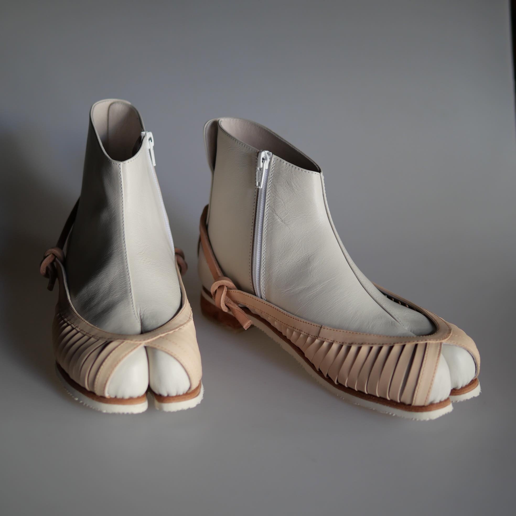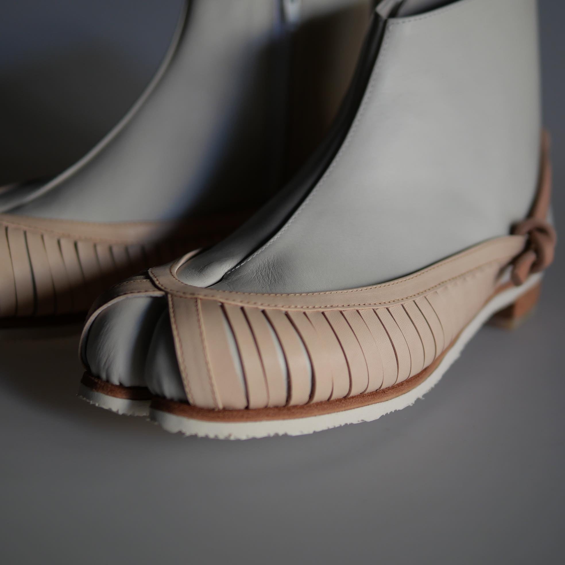 靴底に使用する革底からシームレスに革紐を取り回し、チプシンの縦型のスリット部分の端とノットを作ることで、装飾的な意味だけではなく、足袋のシルエットを足の動きに合わせて支える構造的な仕組みを開発しています。試作段階で検証を重ね、細部の具体的なシルエットに至るまで型紙を詰めました。