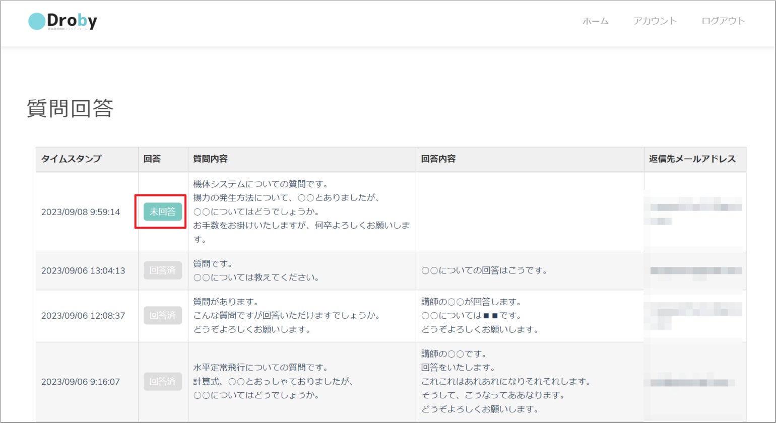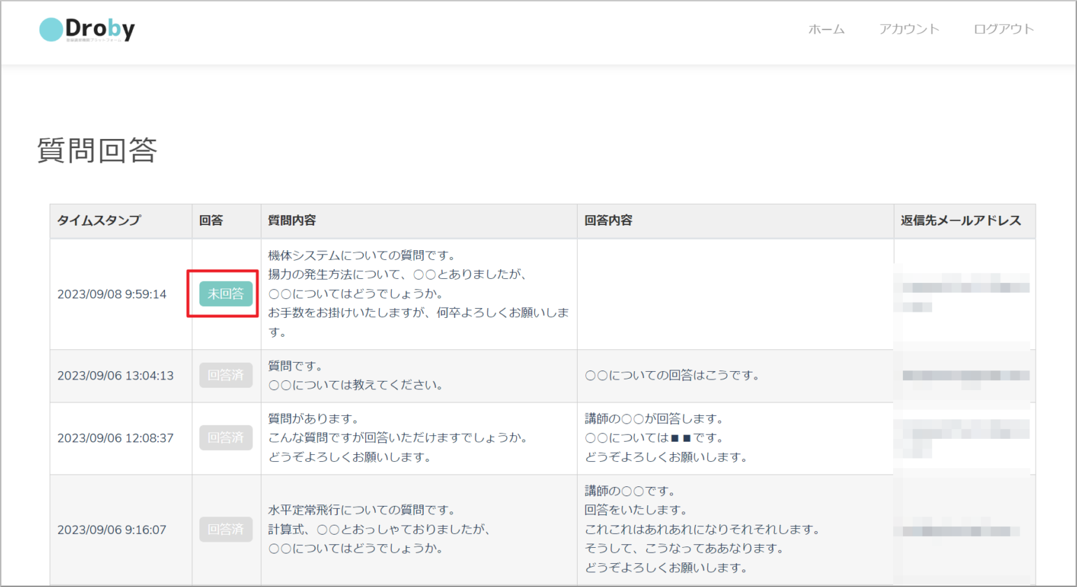 受講生からの質問は管理画面に一覧表示されます。