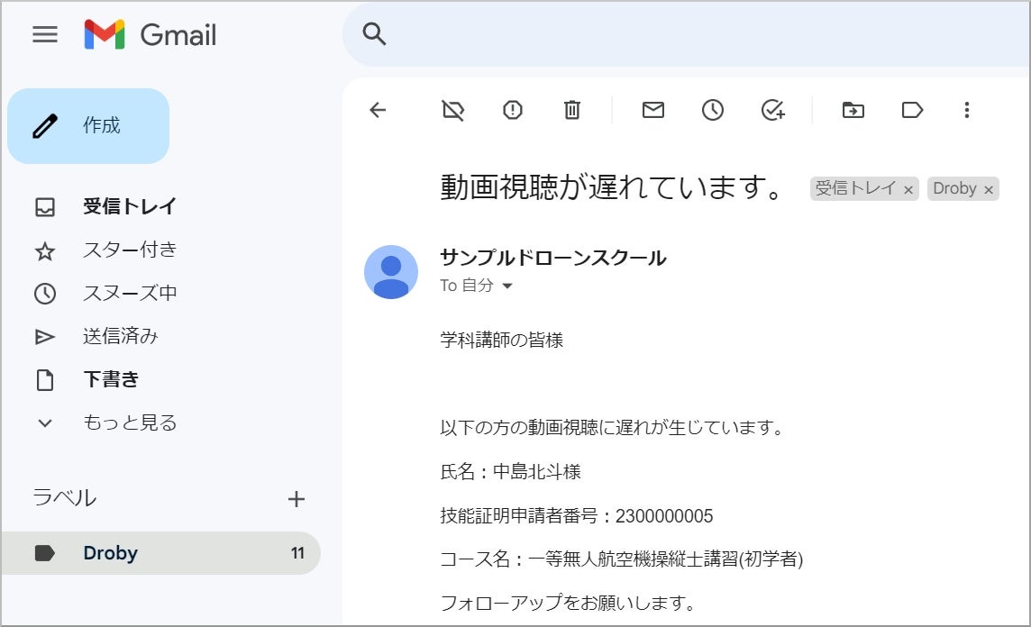 受講生が講習を完了したら、その旨の通知がメールで届きます。