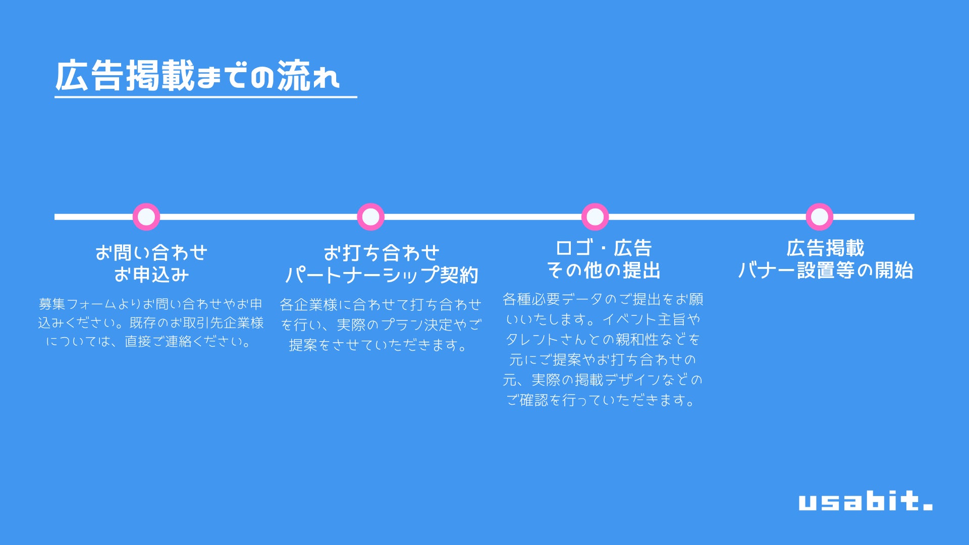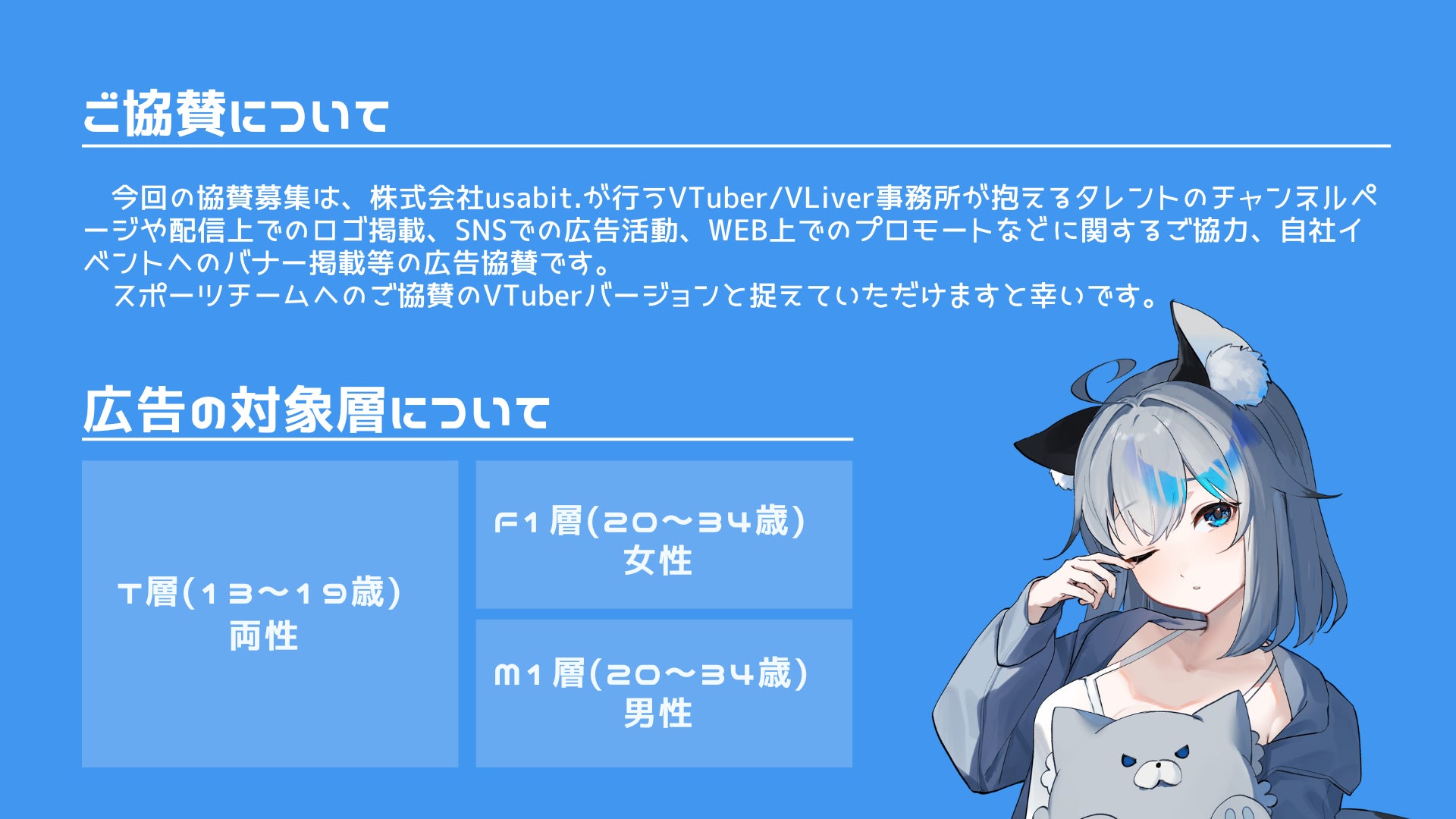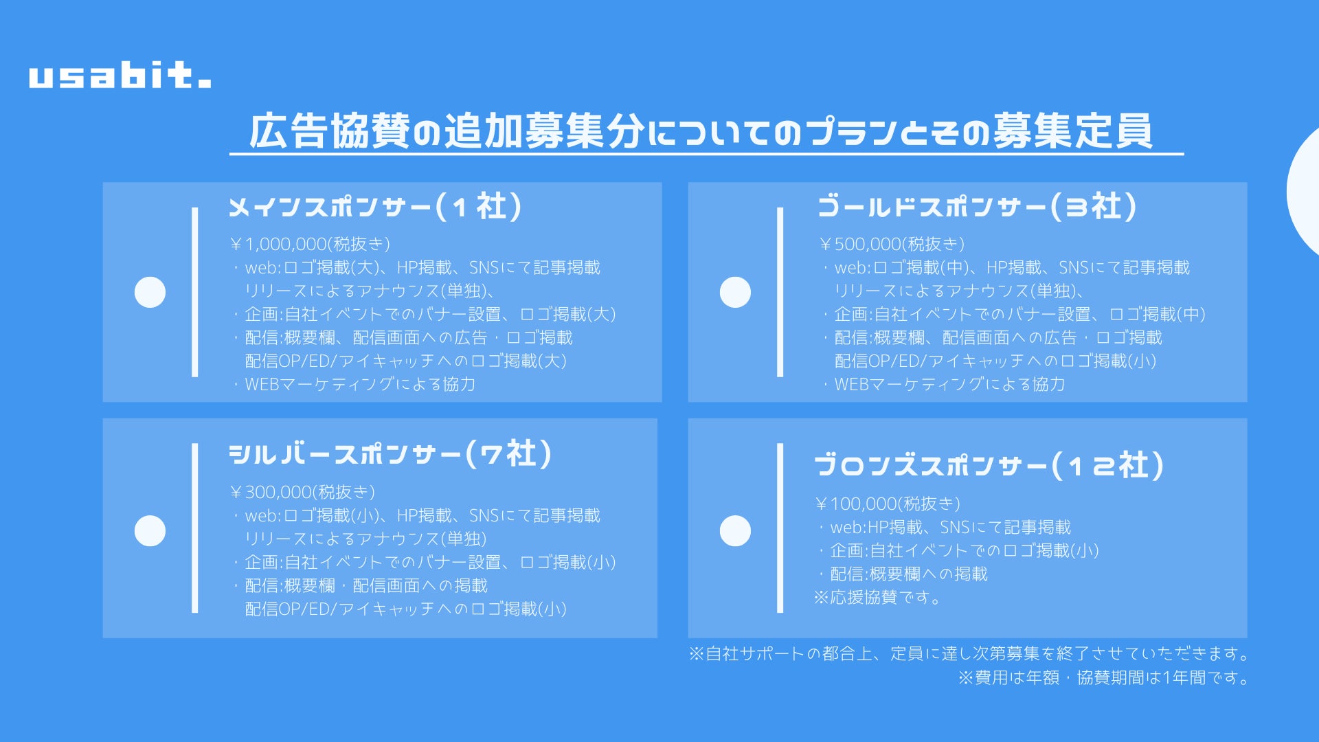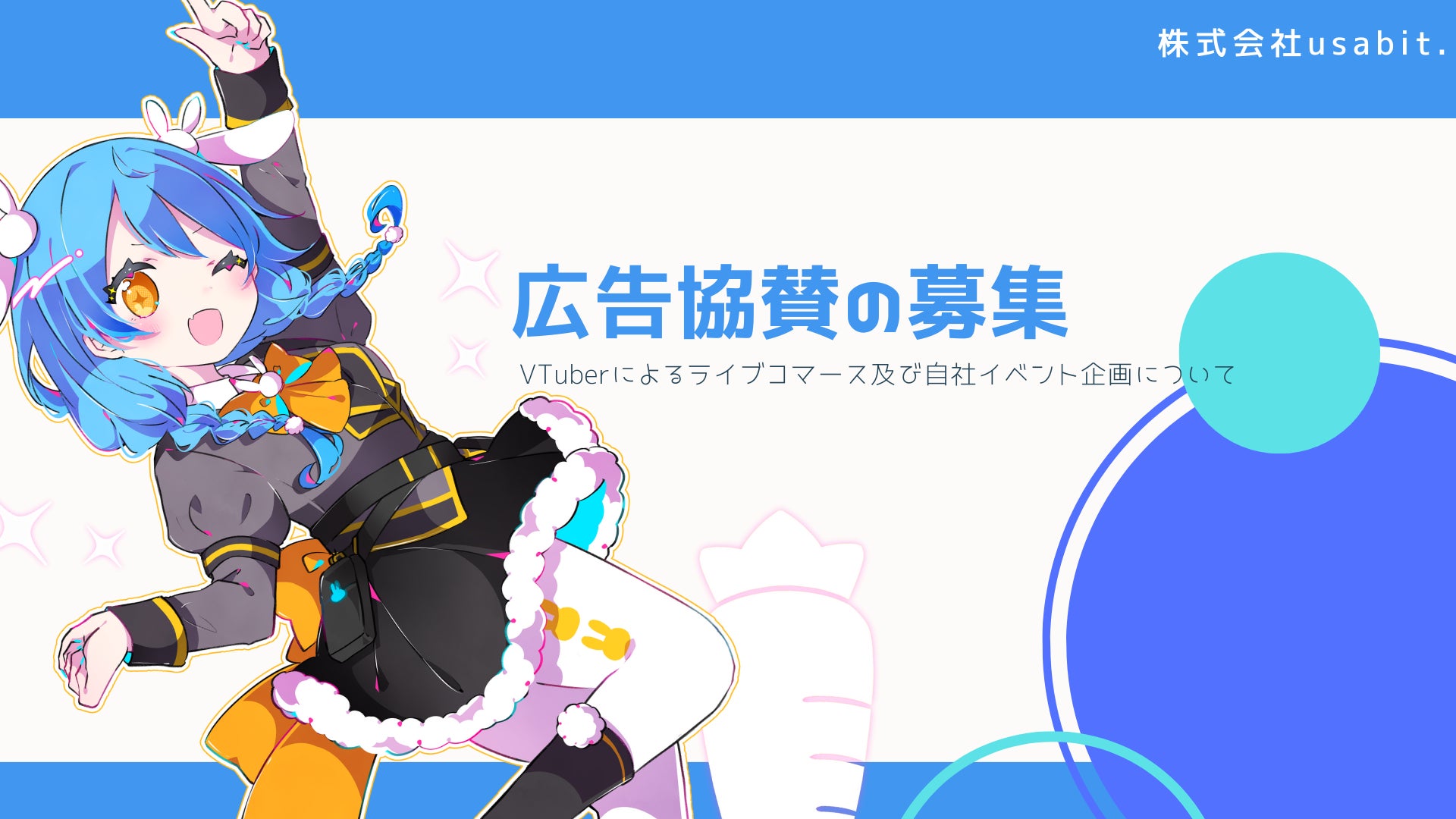 株式会社usabit.(ウサビット、本社:北海道函館市、以下「当社」)はこの度、広告協賛企業の募集を実施いたします。今回は当社所属のVTuberの配信オーバーレイ・自社企画イベントのバナー等を広告枠として提供する形での協賛募集となります。