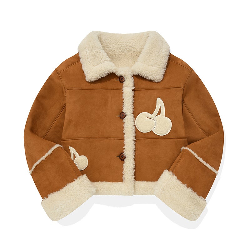 クロップ丈でコンパクトな仕上がりの毛足の長いボアと柔らかい肌触りのフェイクスエードのジャケット。ワンポイントのチェリーロゴをボアで表現しています。