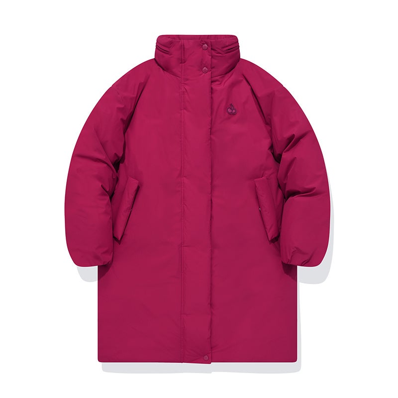 フロントポケットのふっくらとしたデザインが特徴で、胸元にはラバーチェリーロゴがワンポイントとなっているダックダウンを使⽤したロングダウン。フードは収納ができ、2WAY で着⽤可能。