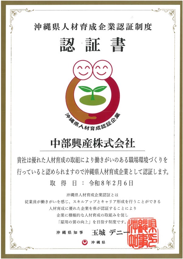 中部興産株式会社(本社:沖縄県沖縄市、代表取締役:新垣貴雪)は、この度、沖縄県が実施する「沖縄県人材育成企業認証制度」に認証されましたのでお知らせいたします。