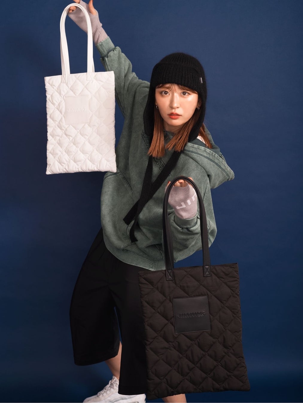 ニットと合わせてロゴを見せるスタイリングがおすすめ。