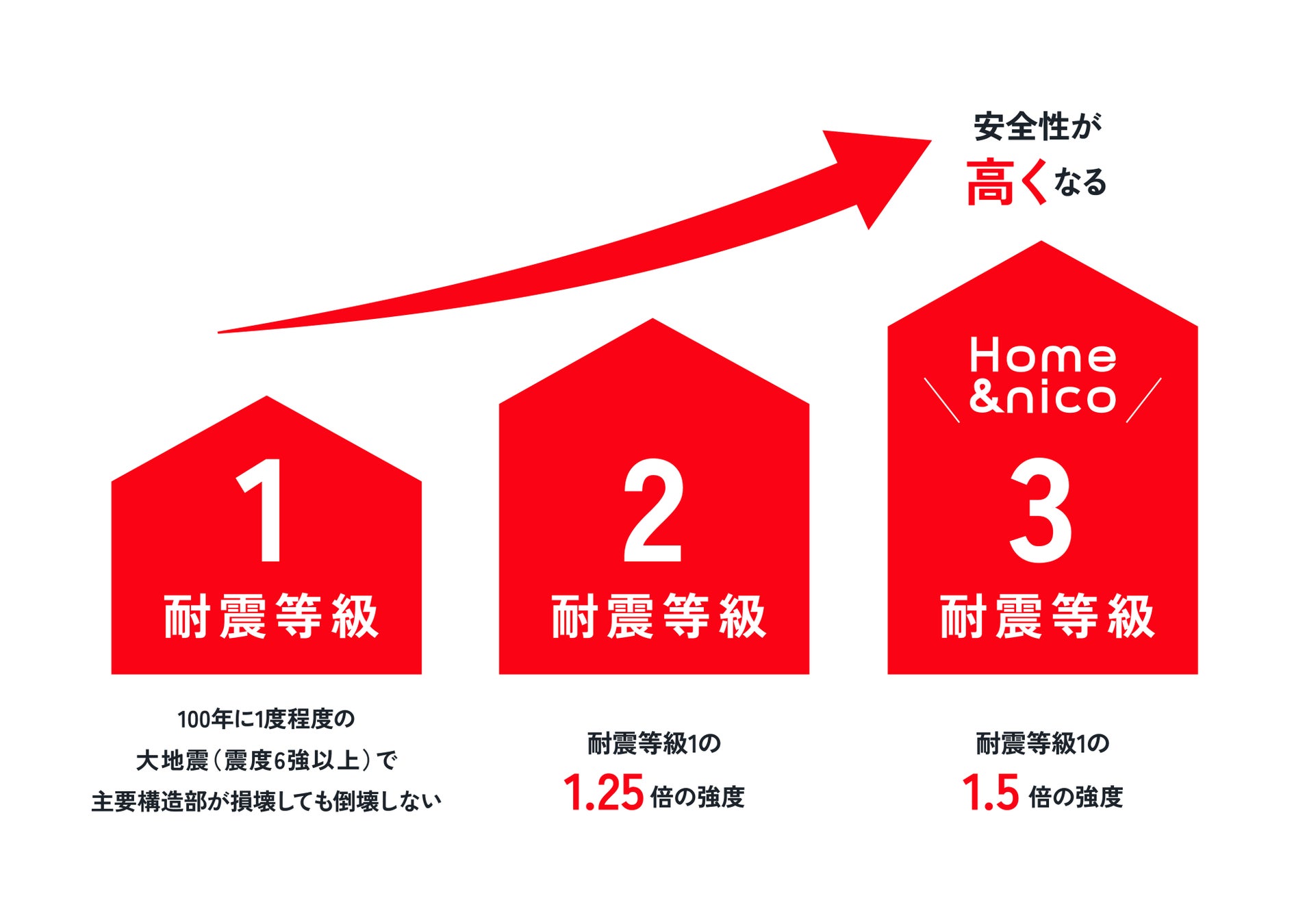 ホームアンドニコでは、地震の脅威から家族を守り、安心して豊かな生活を送れるような住宅を建てるため、以下の対策を全棟で実施しています。