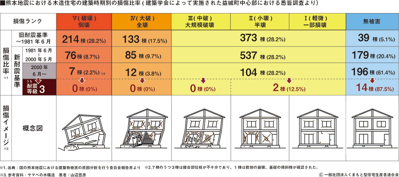 現実に、熊本地震で最も被害をうけた益城町中心部の調査報告によると、激震地に立つ耐震等級3の住宅16棟のうち14棟が無被害、残る2棟は一部損壊。耐震等級1は、大地震でも倒壊せず人命を守るはずでしたが、倒壊した住宅が7棟、全壊したものが12棟ありました。耐震等級2でも倒壊があったと同時に、耐震等級3でも半壊、一部損壊の被害が見られました。