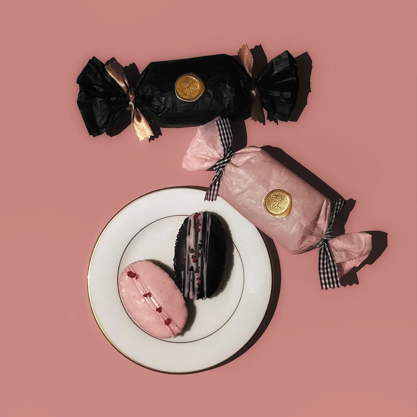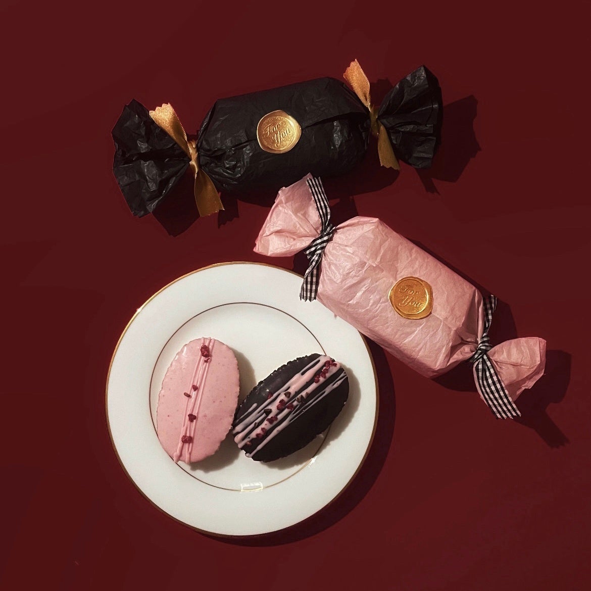 軽やかな口当たりのフィナンシェの上には濃厚なチョコレートコーティングとストロベリーコーティング。