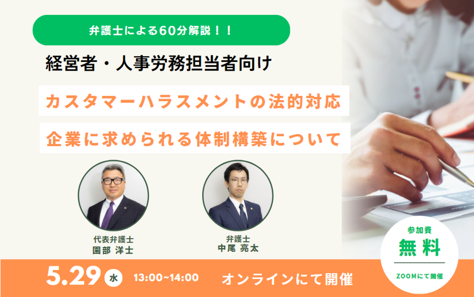 「カスタマーハラスメントの法的対応~企業に求められる体制構築について~」を5月29日(水)無料・オンラインにて開催いたします