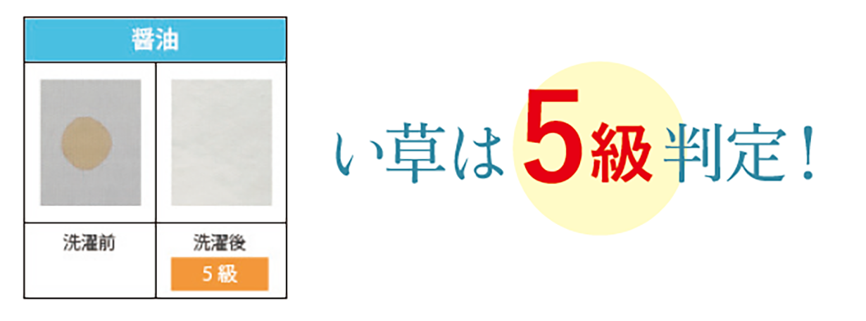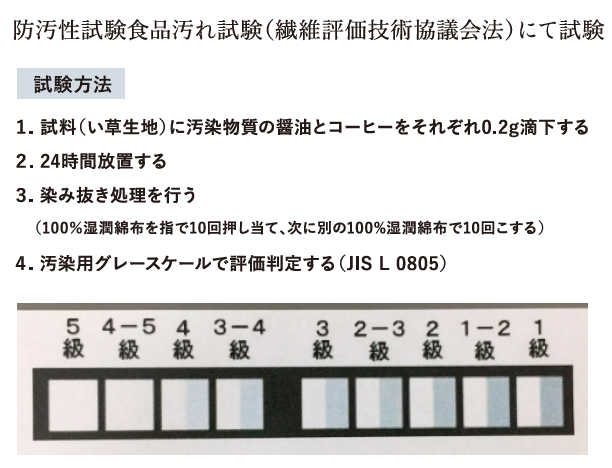 イ草はその表皮の部分に油分を持っているので、非常に汚れにくい性質があります。判定4級以上で防汚性が表示できる繊維の試験で等級5の判定です。