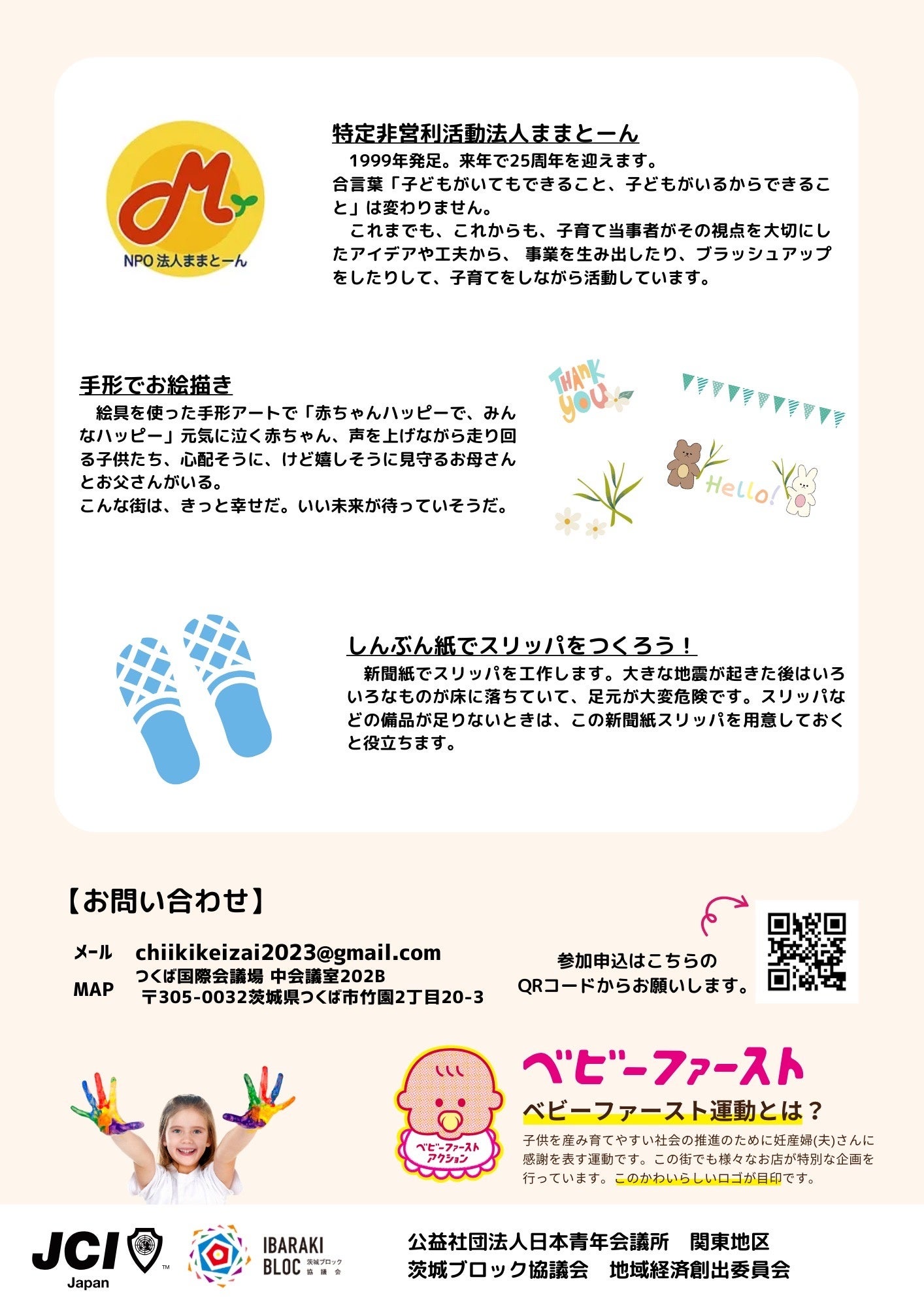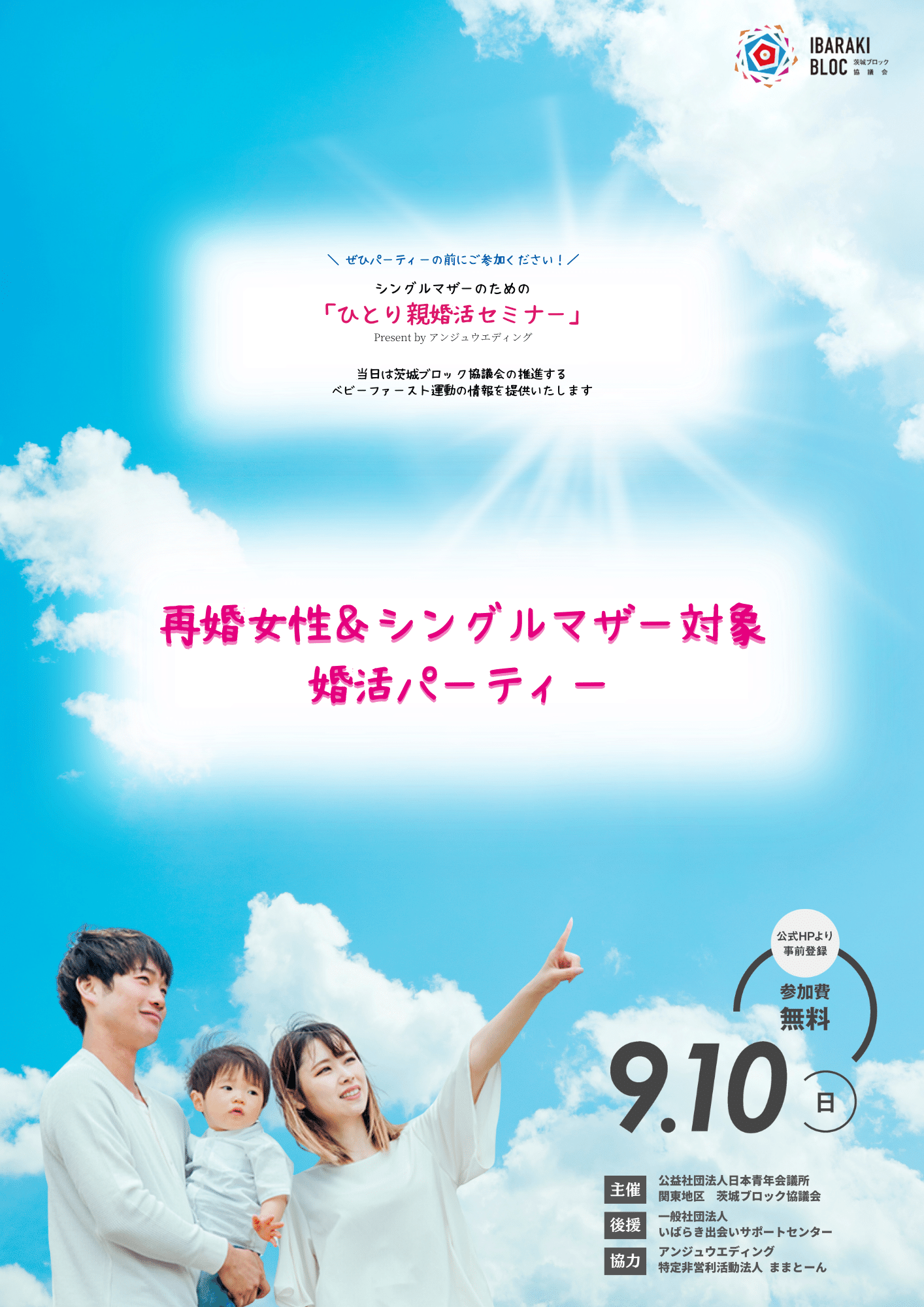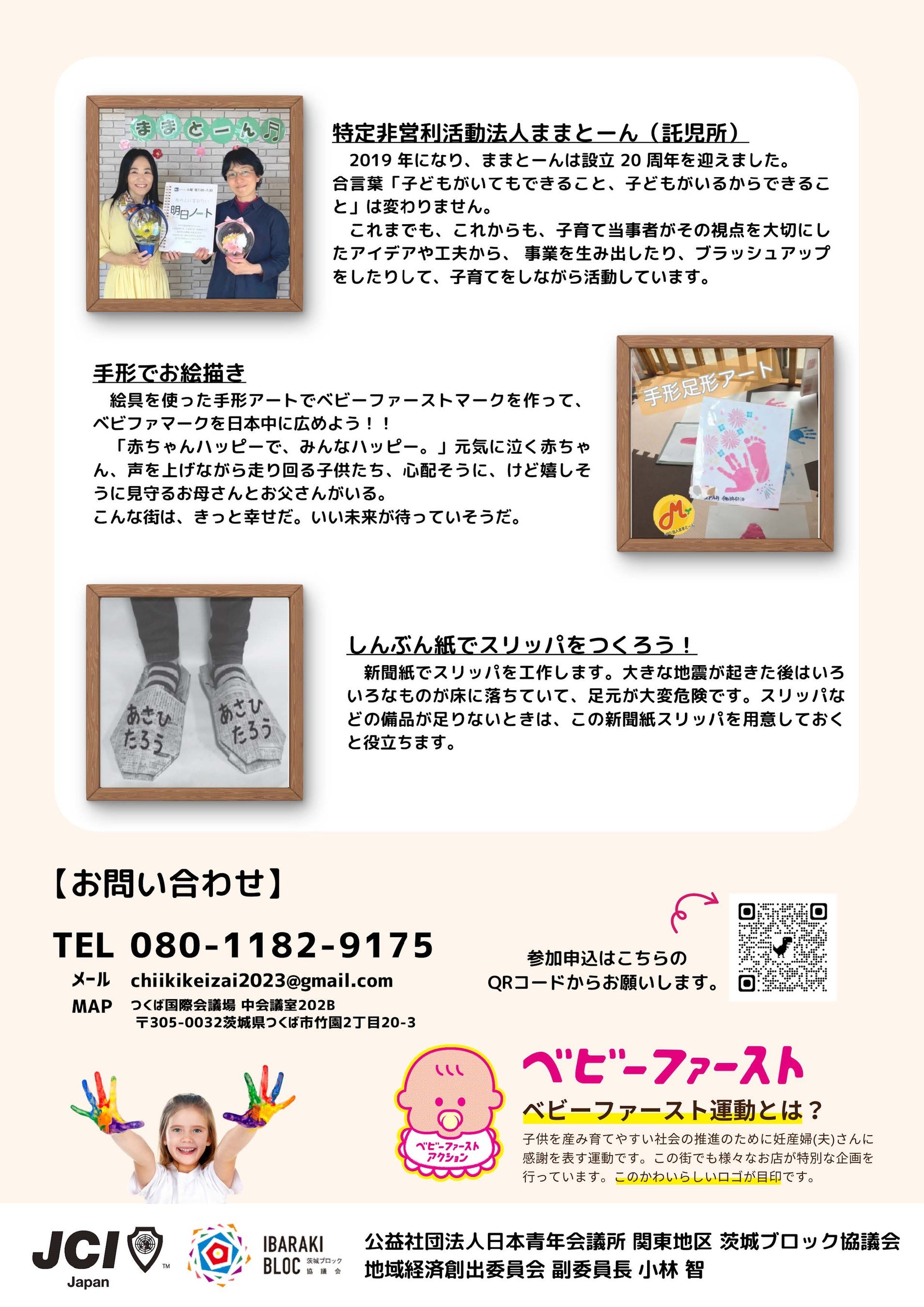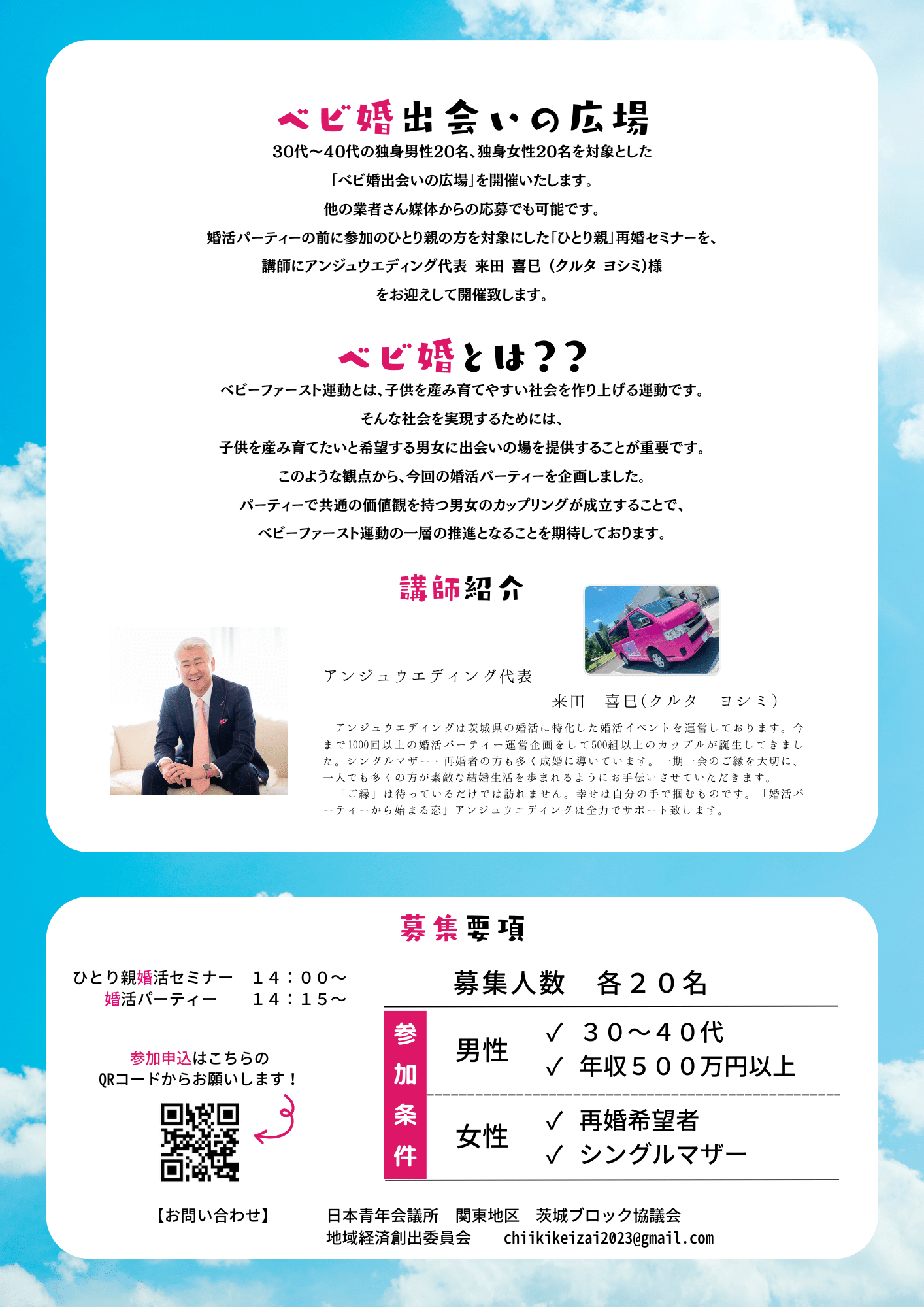 この度、公益社団法人日本青年会議所関東地区茨城ブロック協議会地域経済創出委員会では「ベビーファースト~ 始まりは出逢いから~」を開催いたします。 婚姻件数の減少や出生率の低下が問題視されており、内閣府調査で は子どもを産み育てに くいと考えている国民が 6 割を超えているという結果があります。 そのような背景の中、 結婚や子育てに前向きになっていただくことを目的として 「婚活パーティー」「親子向けワークショップ」を開 催させていただきます。 また、ベビーファースト運動を推進する企業の取り組みを紹介するブースの設営をします。