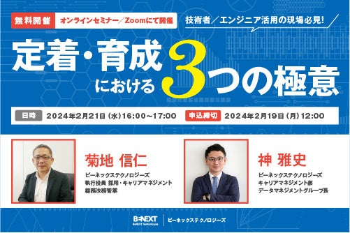 機電・IT領域のエンジニア派遣事業を展開する株式会社ビーネックステクノロジーズ(本社:東京都港区、代表取締役:𠮷井栄伸)は2024年2月21日、エンジニアをマネジメントする管理職向けのオンラインセミナーを開催します。当社がメーカー向けにセミナーを開くのは初めて。
