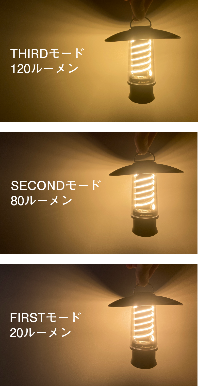 周囲全体を照らすランタンモードは、3段階選べるようになっており強い灯りのTHIRDモード、ちょうどいい灯りのSECONDモード、ロウソクのような雰囲気を楽しめるFIRSTモードの3つの色温度を選択できます。アウトドアで強い光で全体を照らしたいときには、THIRDモードの「強」で、お酒を楽しみながらまったり雰囲気を楽しみたいときには、FIRSTモード「弱」またはSECONDモード「中」でとシーンに合わせて灯りの種類を選ぶことができます。