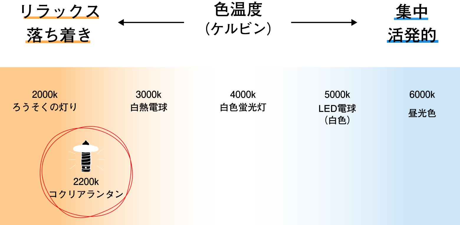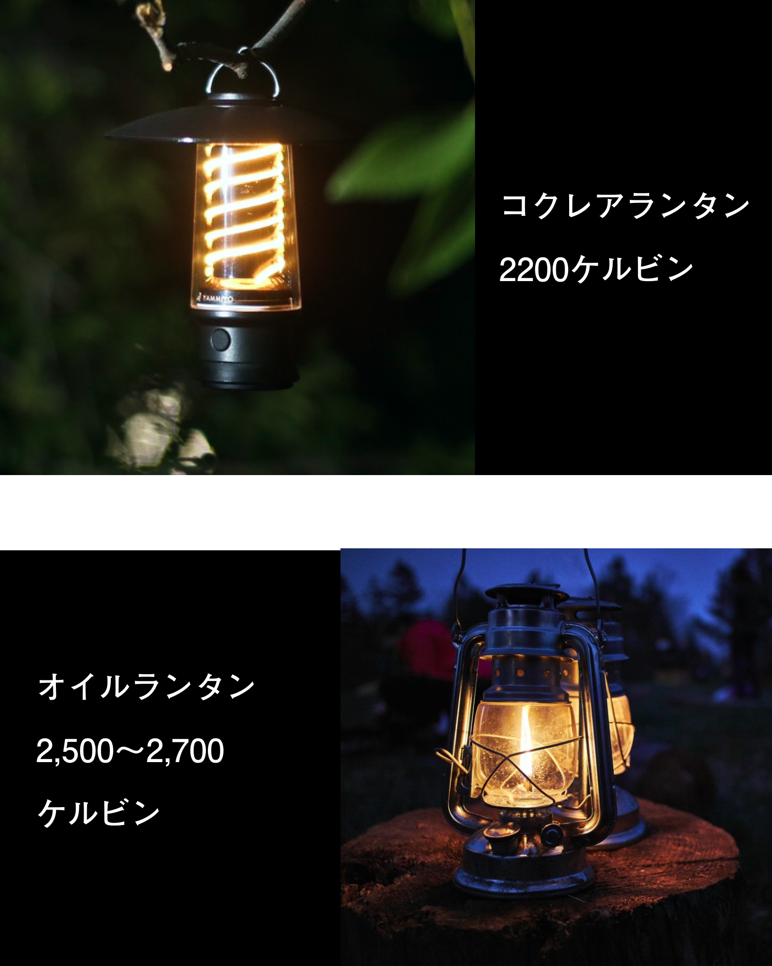 キャンプで心を安らげて欲しい。という思いを込めてコクレアランタンは、ロウソクの灯りに限りなく近いケルビンに調整している。