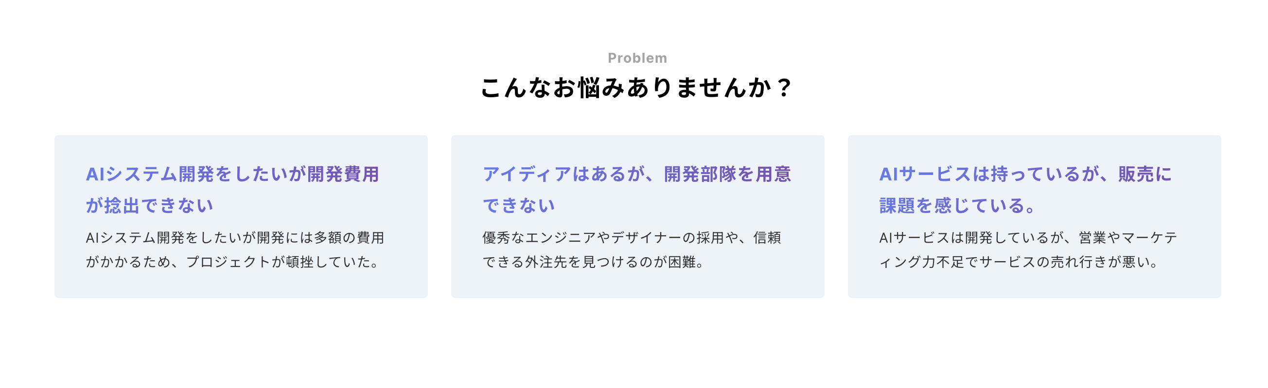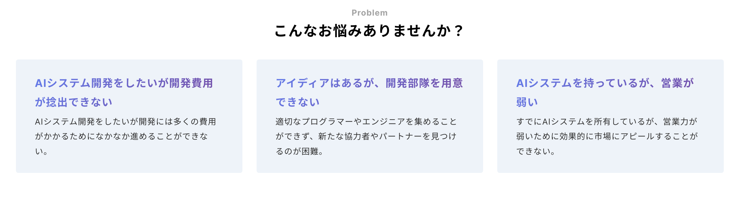 AIシステム開発には興味があるが、技術面や資金面が課題で開発に着手できなかった企業様に対して、安価で質の高い、開発・マーケティング体制を提供することで、欧米諸国に比べてAI後進国と呼ばれる日本のAI化・生産性向上に貢献していきます。